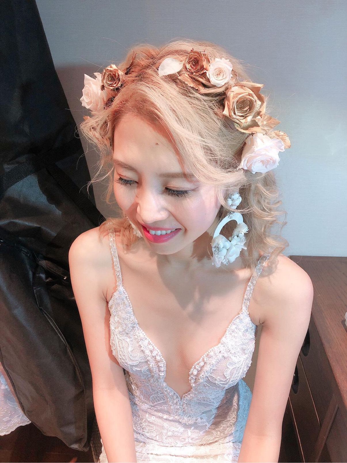 ウェディングドレスの時はガーデン挙式だったのと、ボーホーなイメージなので、あまりかっちりしたものではなく、ラフなダウンスタイルのハーフアップにしました。お色直しではシンプルながらゆるふわな感じでアップスタイルに。