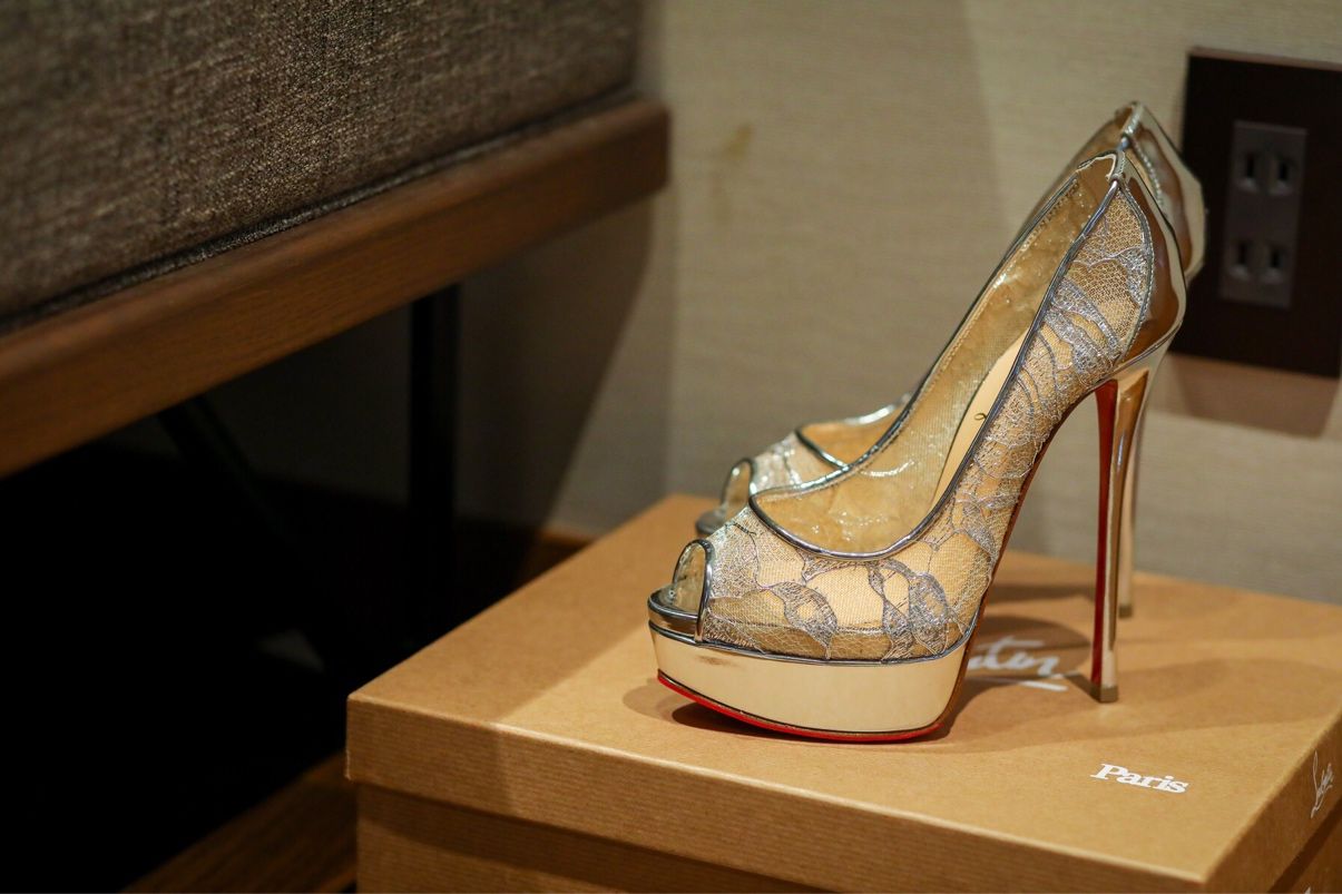 ウェディングドレスをかっこよく着こなすため選んだ15センチヒール。ブランドはルブタンのシルバーのレースの靴。こちらもニューヨークで購入。
