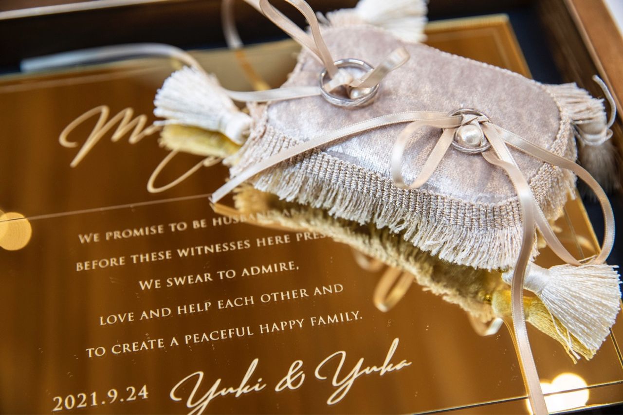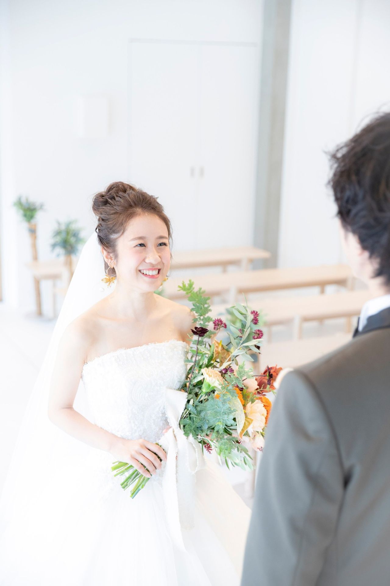 チャペルで行うことができました。扉に背を向けて私たちが立っていて、両親が入ってきて肩をとんとんとされました。振り返った瞬間、涙ぐみながら笑顔で私たちを見てくれる両親がいて、うるっときました。母があまりに大粒の涙を流しているから笑っちゃいました。