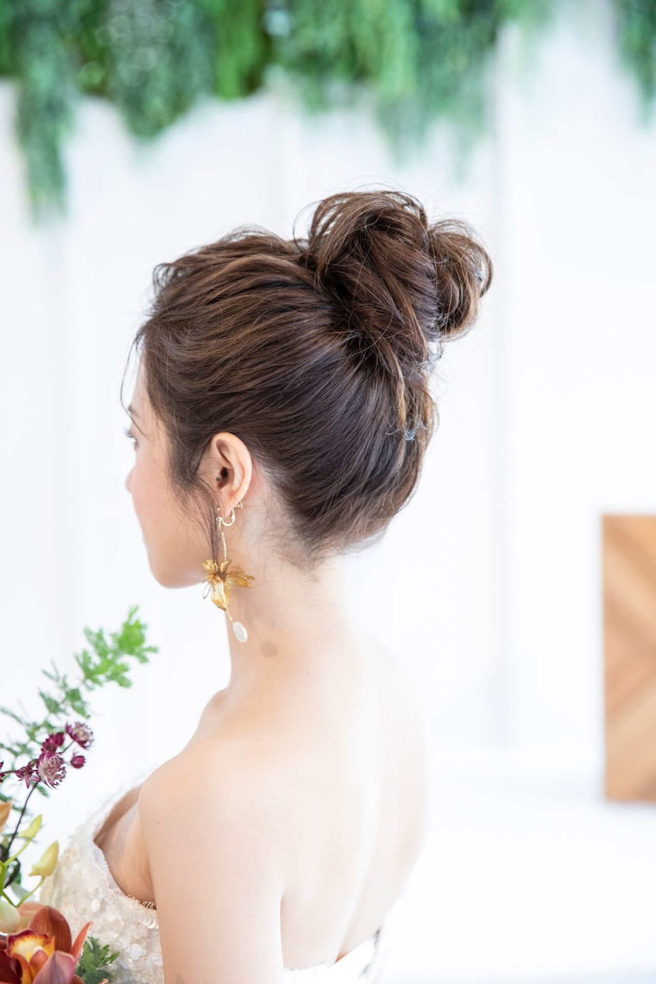 挙式はアップスタイルのお団子に、披露宴は高めの変形ポニーにしました。お団子の時は前髪もアップ、披露宴の時はくるくる前髪にして印象チェンジしました。