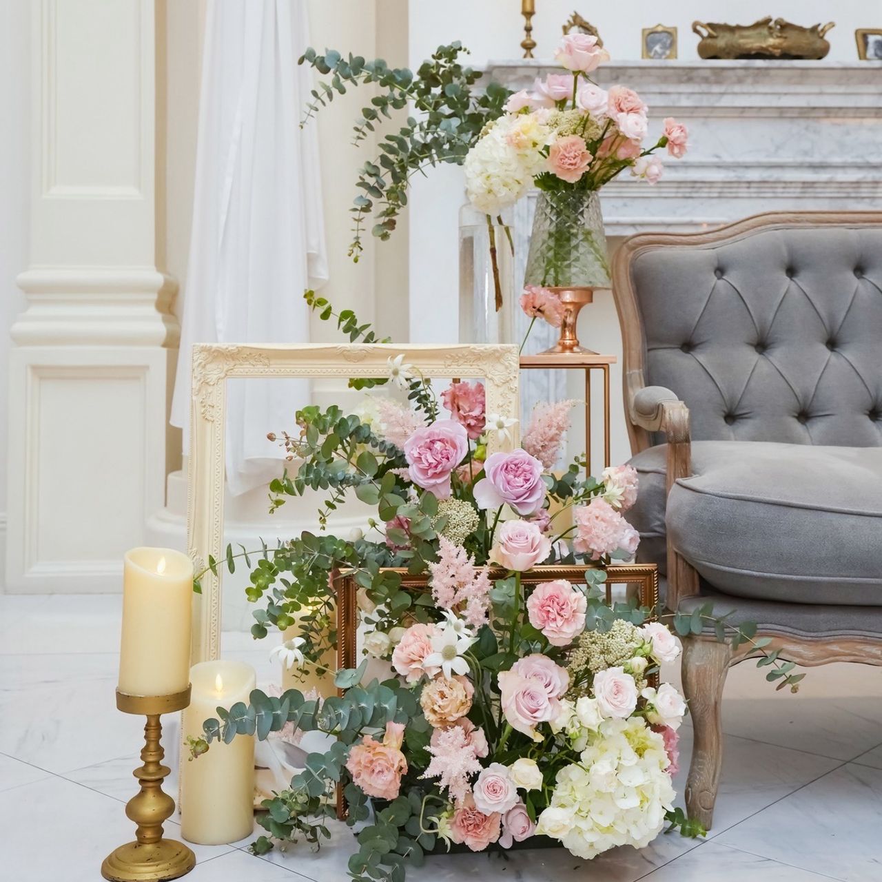 インスタグラムなどで自分の好みの雰囲気の装花を探し"薄いピンクのバラ"をメインに仕上げていただきました。