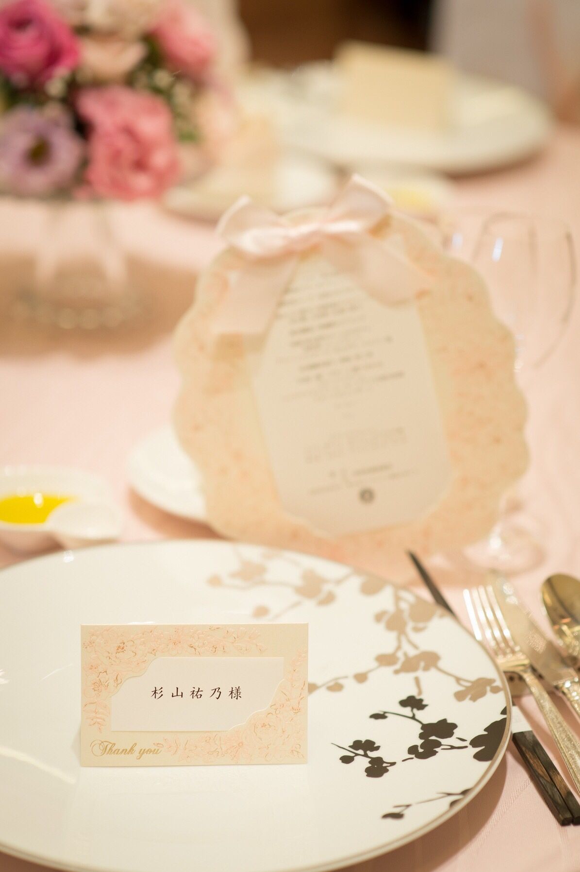 また、チョコで作ったピンクの大きいリボンと、大きいピンク色のハートのチョコに、2人の名前や挙式日を記載してもらい、それを正面に飾って頂きました!
