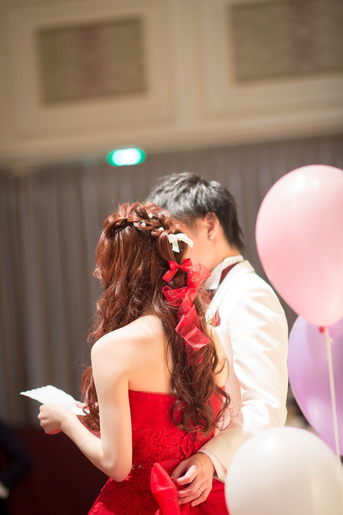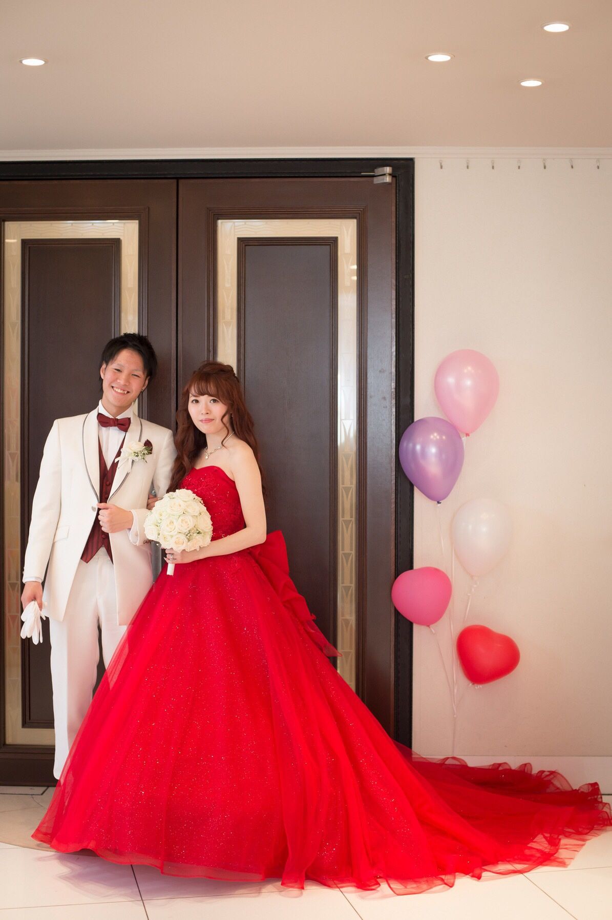 ・お色直しでは、沢山の赤、白リボンやパールを使い、ドレスにもついているリボンと合わせて可愛らしくしました。