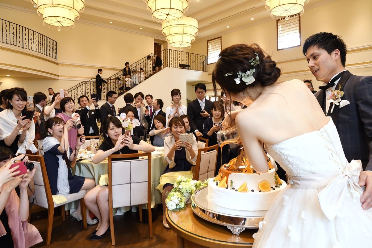 ファーストバイトは行わず、お互いの母にサンクスバイトを行いました! ケーキカットの代わりにケーキドリップでキャラメルソースをかける演出を行いました!