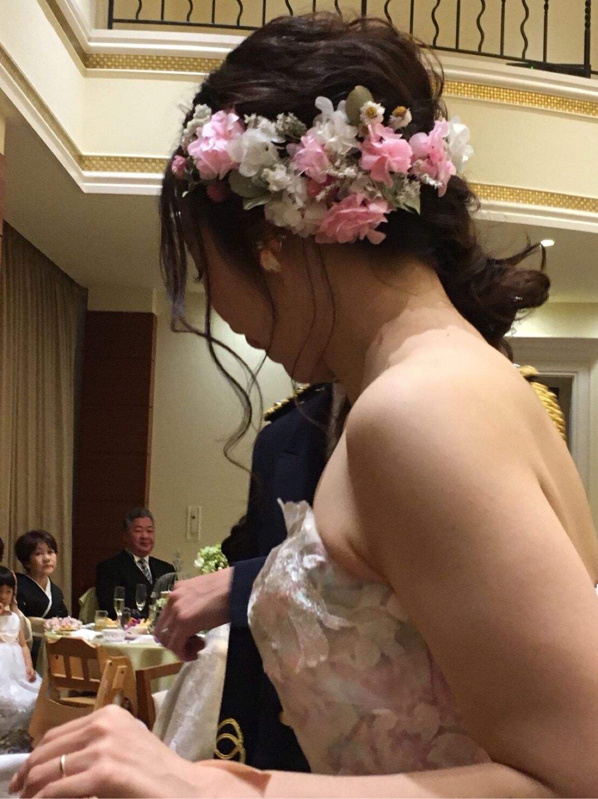 カラードレスのヘッドアクセサリーは友人のフラワーショップにお願いして、パンロミナに合わせてドライフラワーで作っていただきました。