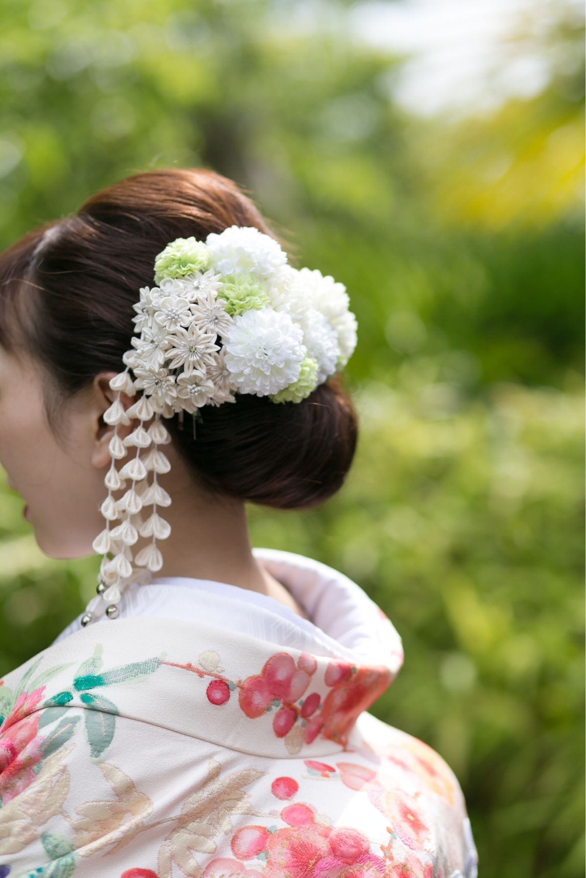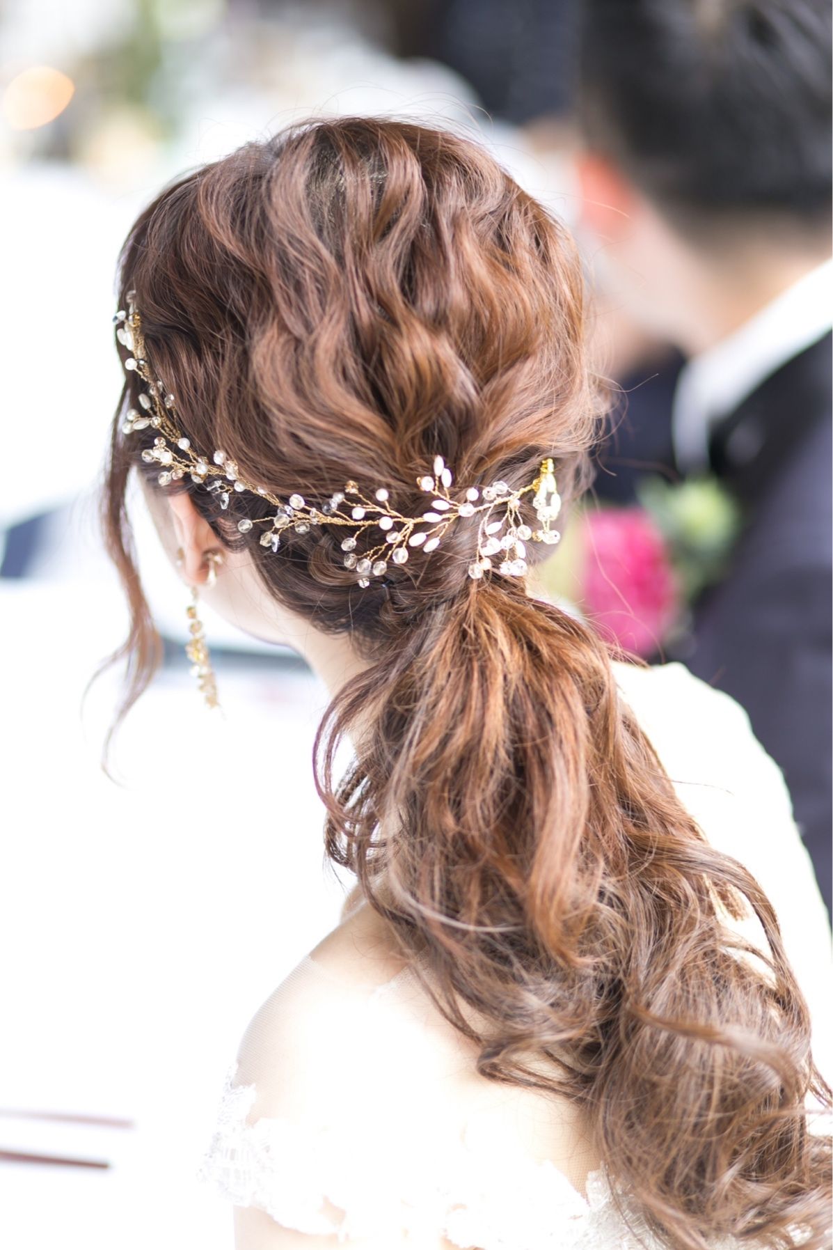 1着目のヘアスタイルは、髪全体を巻いたり編み込みにしたうえで、シンプルなローポニーにしました!ただ、私は普段はボブくらいの長さなのですが、ゲストにびっくりしてもらえるように部分ウイッグを付け、ロングヘアにしてもらいました! そして、バックに小枝アクセサリーをつけて可愛い雰囲気に ゲストや旦那さんにも自然!かわいい!と言ってもらえ大満足です 。2着目は和装だったため思いっきり雰囲気を変えてもらうようオーダー。 表面の髪をストレートアイロンで伸ばし、シンプルなシニョンに 以前ソウドウで式をされた卒花さまからおゆずり頂いた白のお花や鈴のついたヘアパーツを付けました。