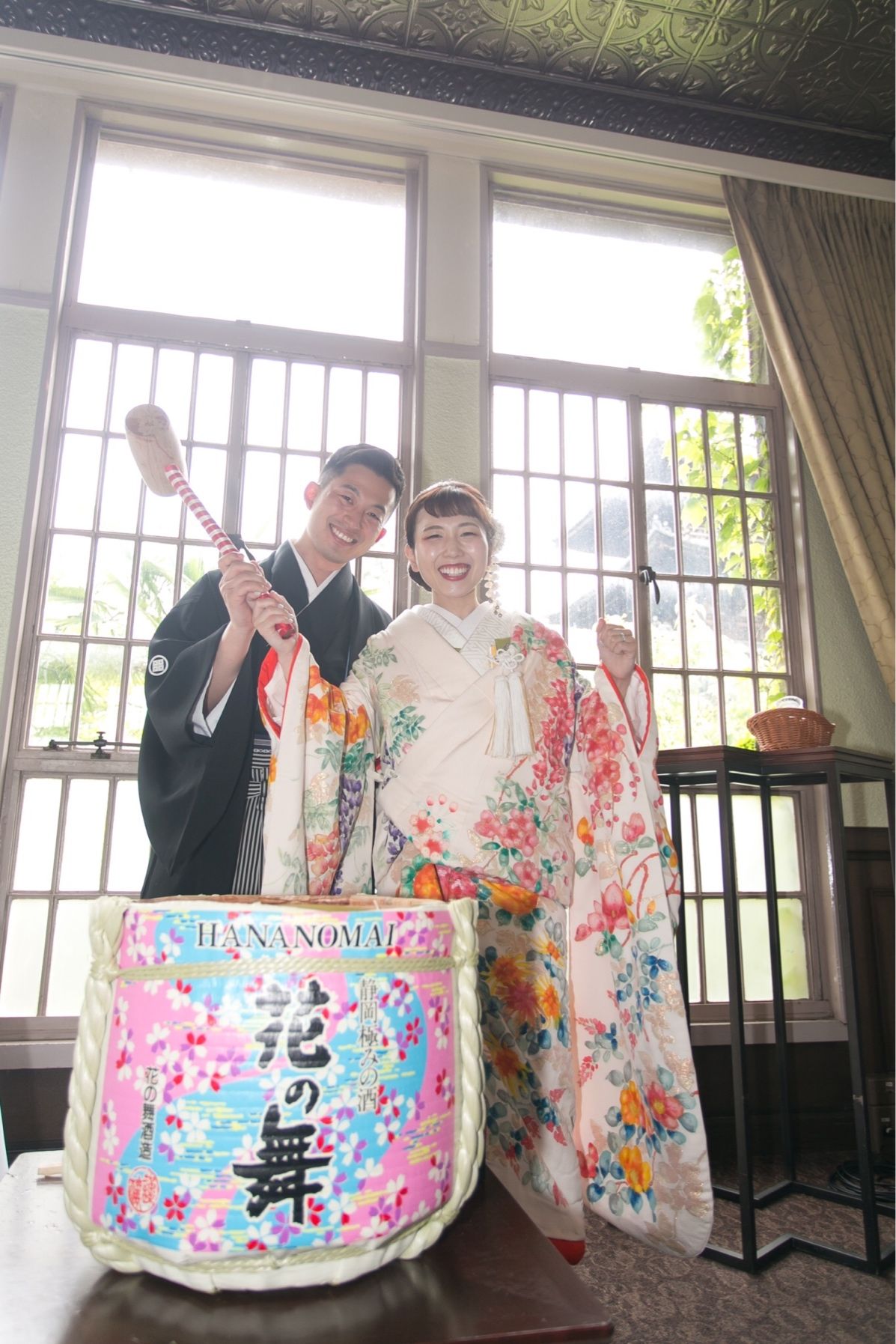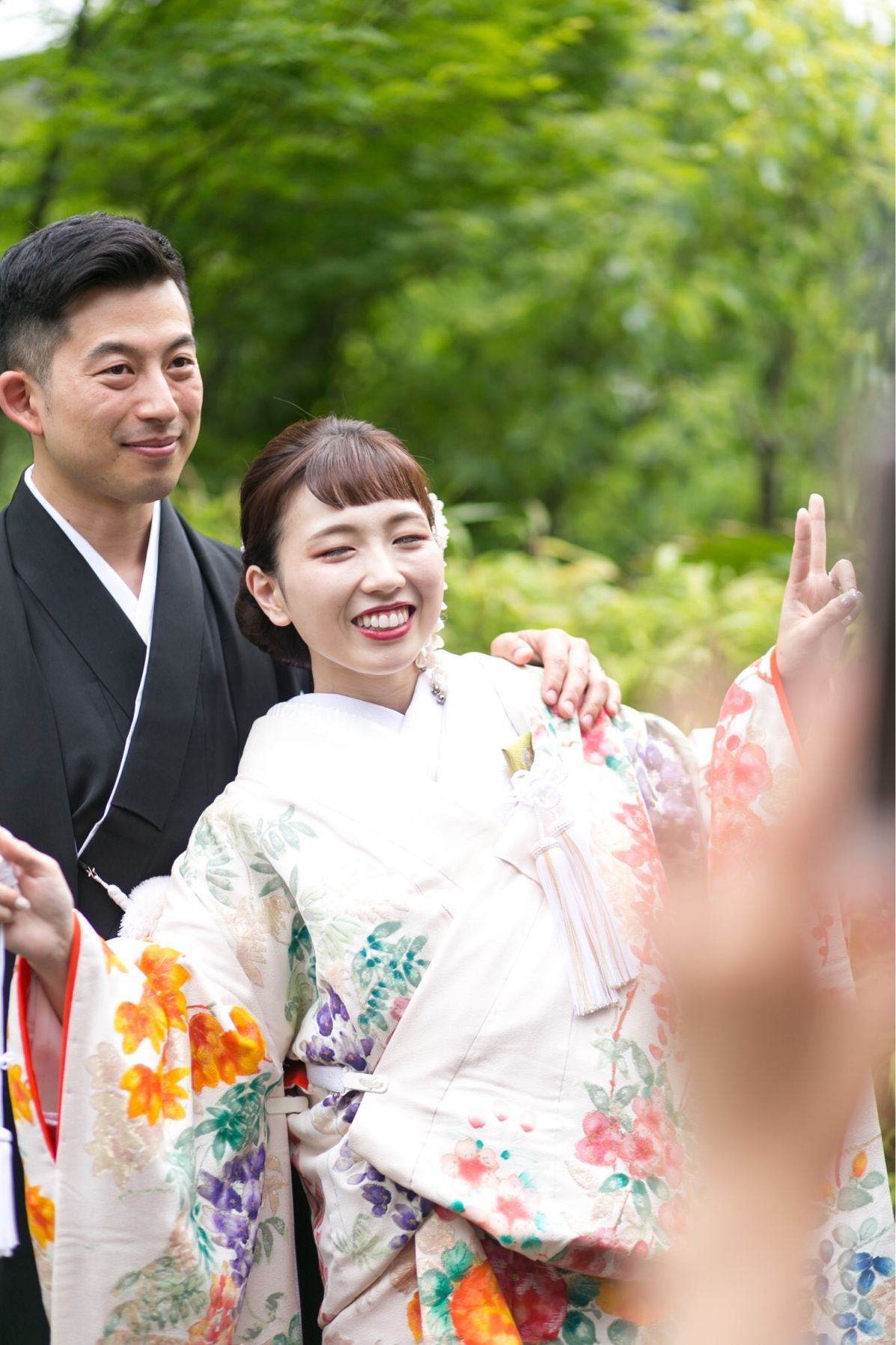 初めは着物らしいレトロで伝統的なデザインで探していたのですが、私が身長も低く童顔のためあまり似合わず・・・ そんななかで担当さんがおすすめしてくれたオフホワイトのような白地に、ピンクや水色のカラフルな花柄があしらわれ、とてもかわいく春らしい雰囲気のものでした。 5月の式だったので、ソウドウの新緑とも映えそうと思い、即決で決めました!