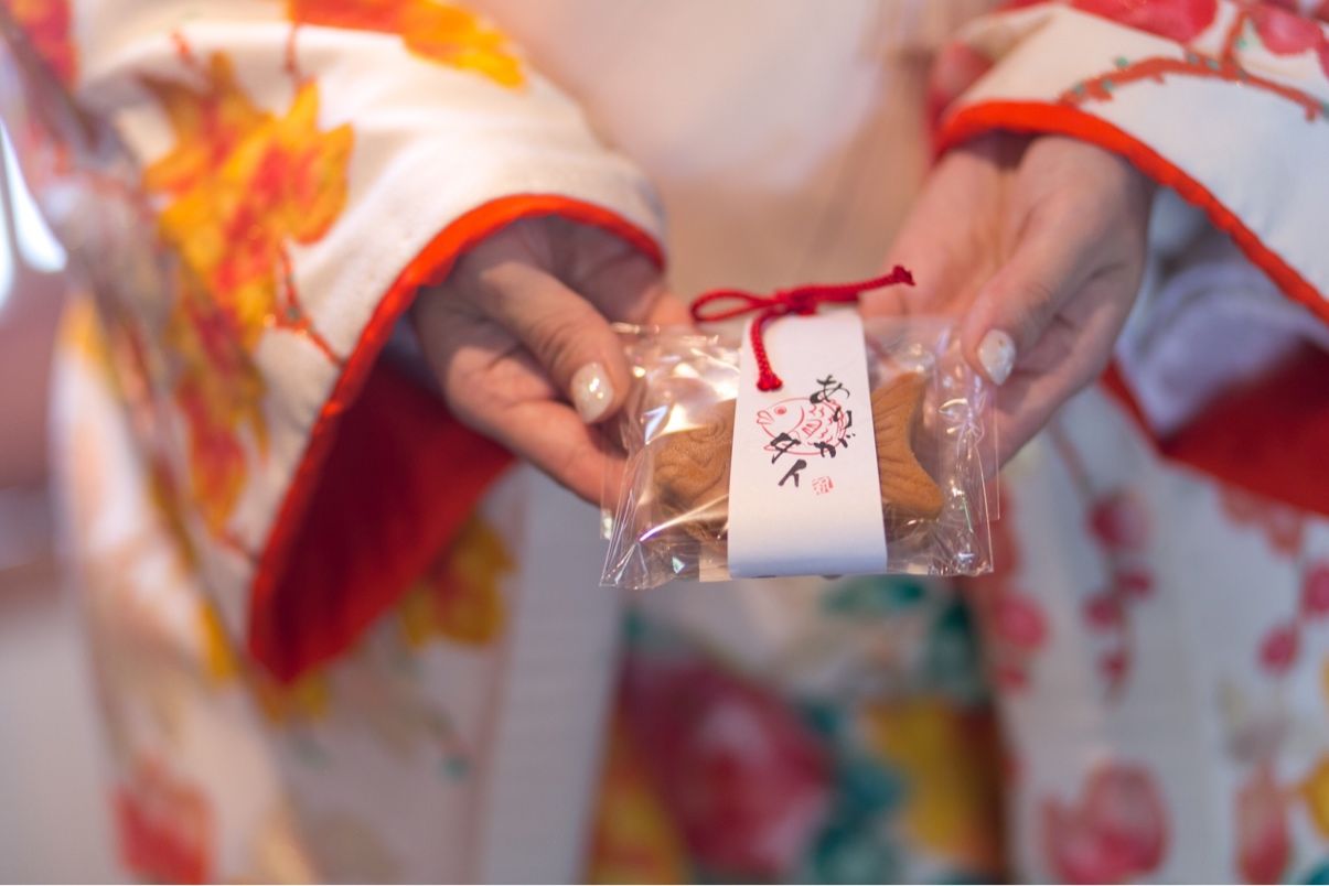 ありがタイまんじゅう(ピアリーさんで注文しました。小さいたい焼き型のおまんじゅうで、パッケージにありがタイとかかれたものです) 色打掛でお見送りだったため、和っぽいものにしました。