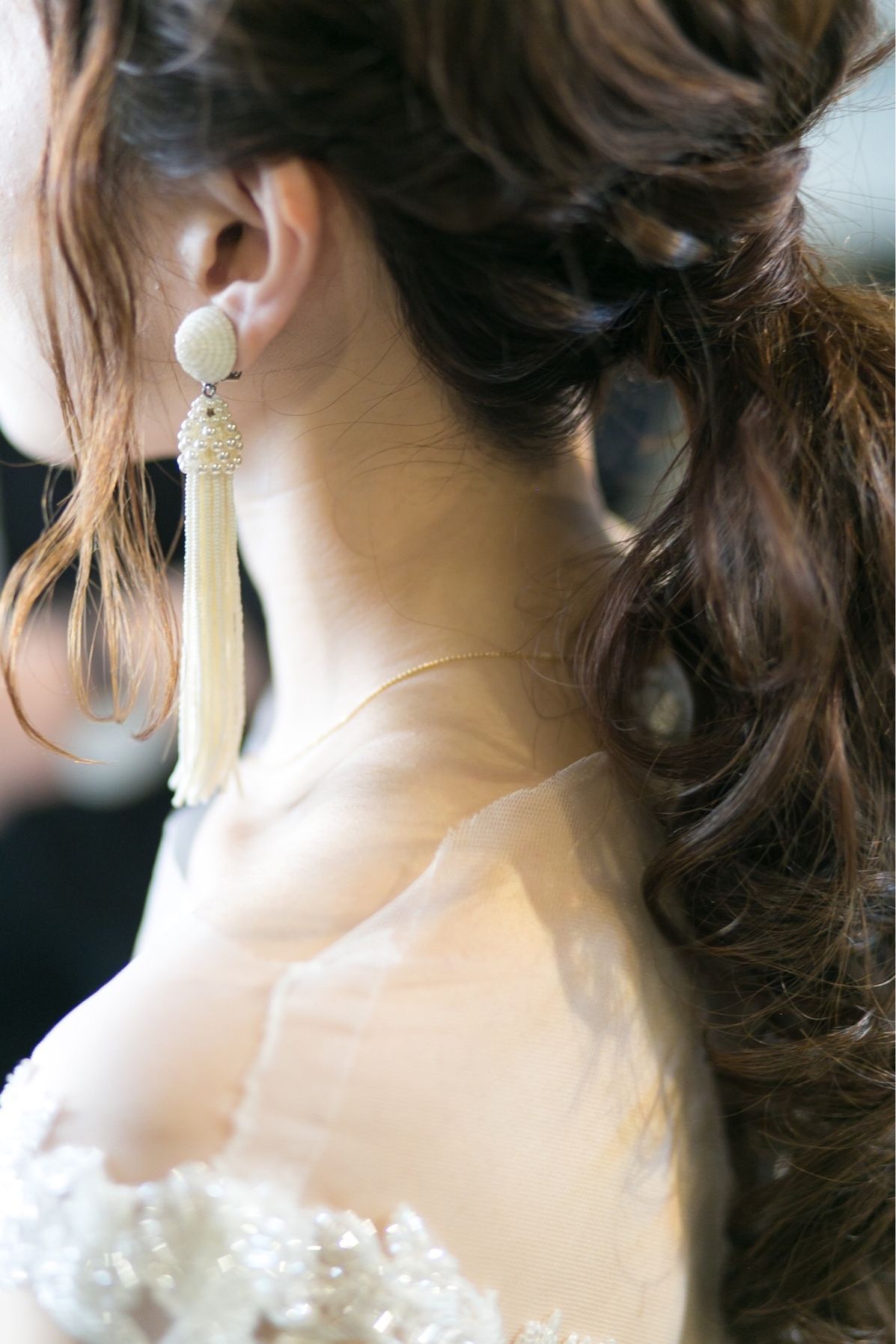 挙式時はorgabrancaさんのホワイトビーズのロングタッセルイヤリングで大人っぽい雰囲気に。披露宴ではインスタで見つけたnu.acceさんという作家さんにオーダーさせて頂いたヘッドアクセサリーに合う大振りのゆらゆら揺れるイヤリングを作ってもらいました。 ネックレスは挙式披露宴通じて、高齢のため来られなかった祖父母が20歳のとき記念にプレゼントしてもらい、それ以降毎日つけているダイヤの一粒ネックレスを身につけました。