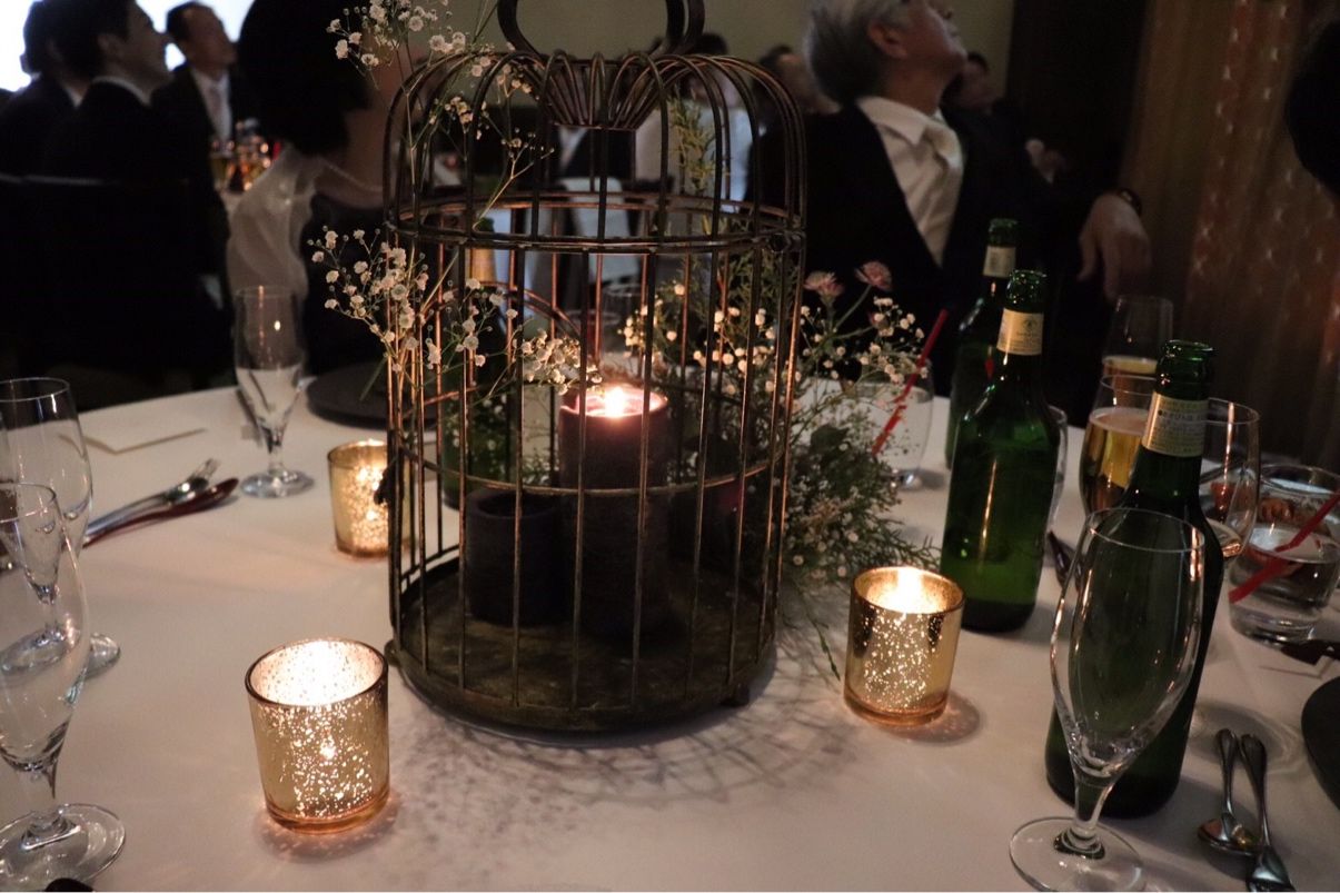 装花は、式場提携の日比谷花壇さんにお願いしました 。披露宴会場に合わせてアンティークな雰囲気になるようにオーダー。 豪華絢爛というよりは、ナチュラルにホワイトやグリーンをベースに、赤紫や青、紫系を入れて大人っぽい雰囲気になるようお願いしました。 主に使用したのはユーカリ、かすみ草、ドライフラワー、ローマなどでほぼおまかせしました。 また、フローリストさんからの提案で各卓に鳥かごを置いてもらったのと、アイテムフェア特典でキャンドルを置いてもらいました。