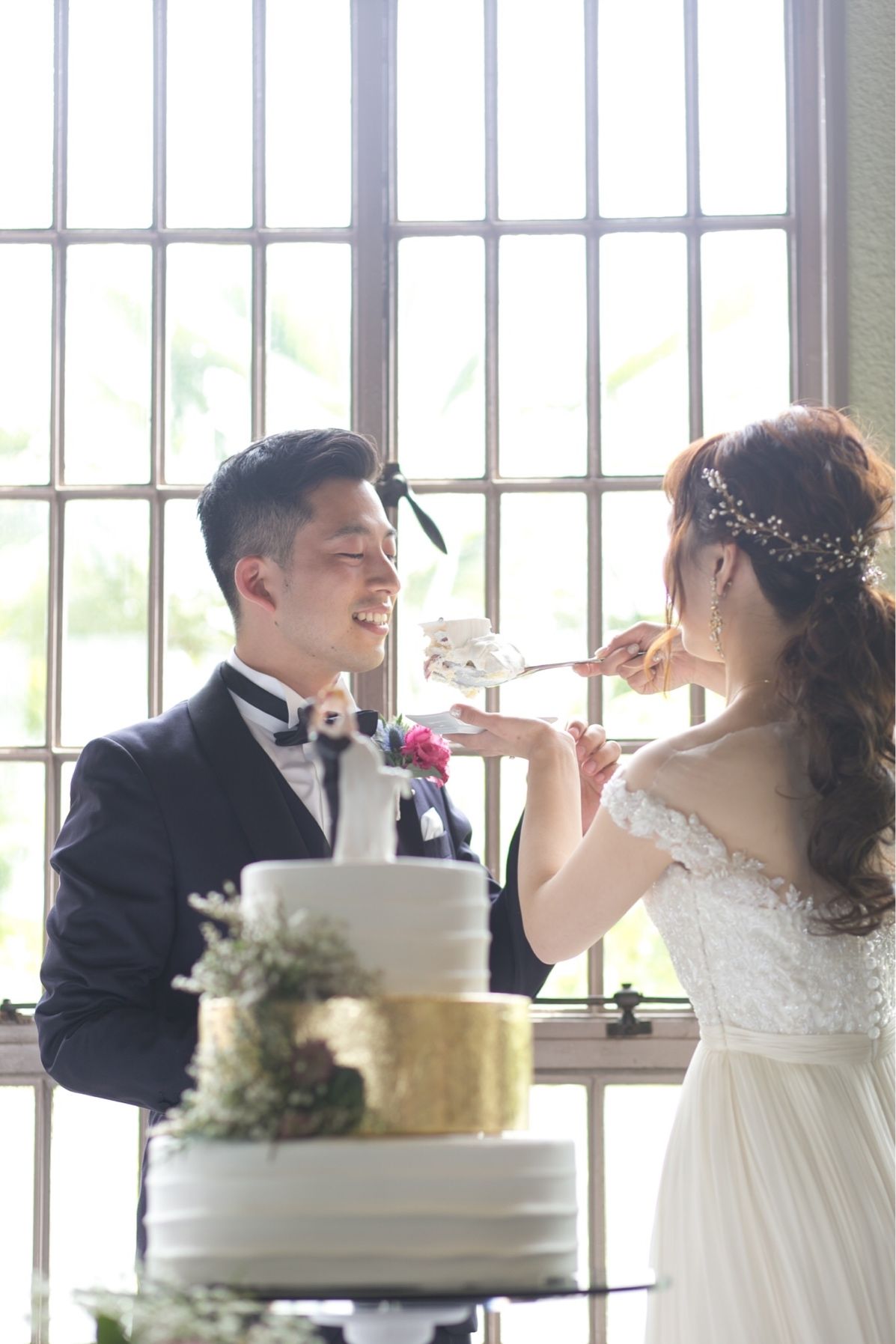 シンプルだけど、結婚式らしい3段ケーキをオーダー。 金箔をあしらいつつも、派手になりすぎないよう、装飾は少しお花をつけてもらっただけのものを選びました。