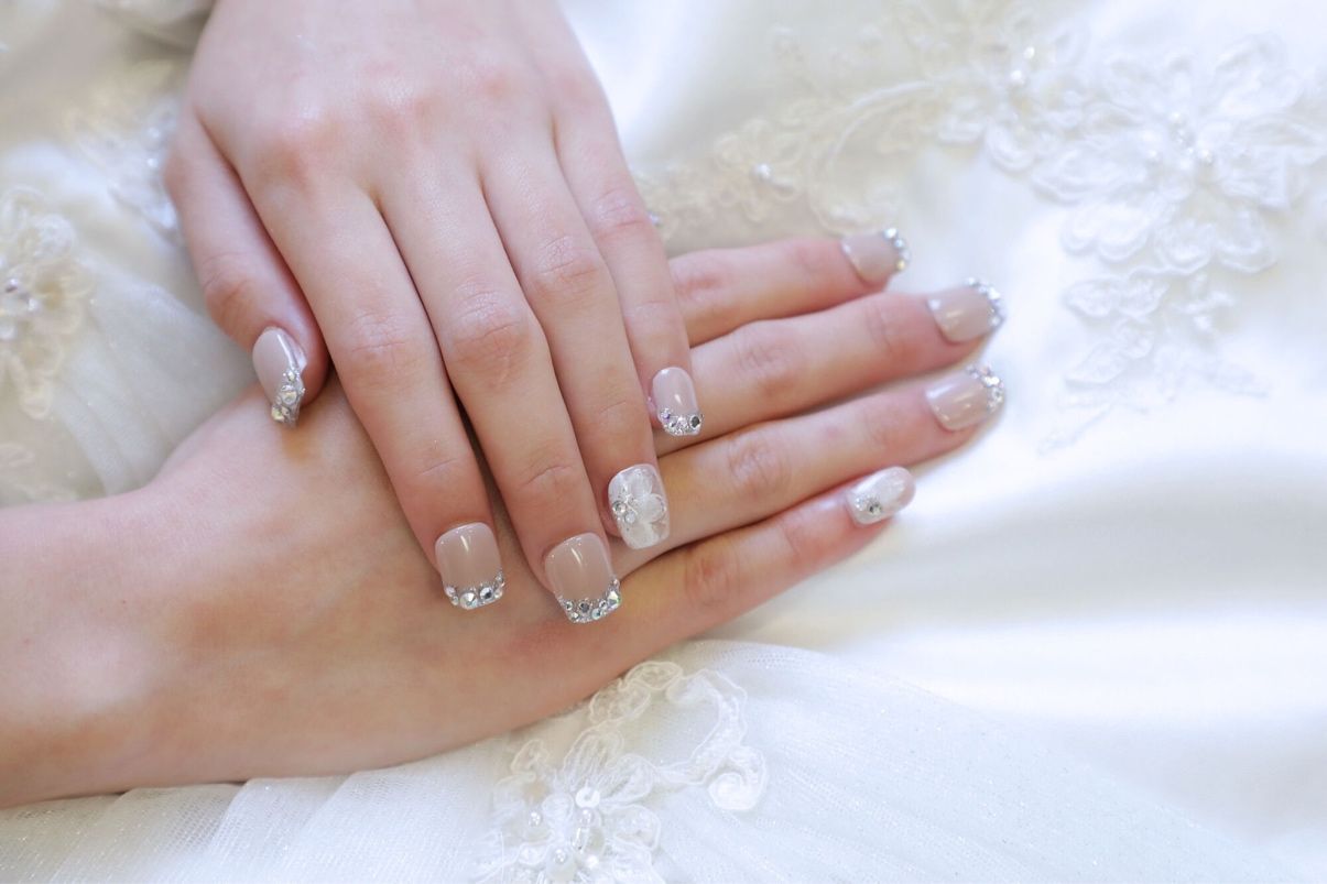 ベースがベージュぽい色で、爪先にストーンとラメ、大型の花を2.3個つけました。