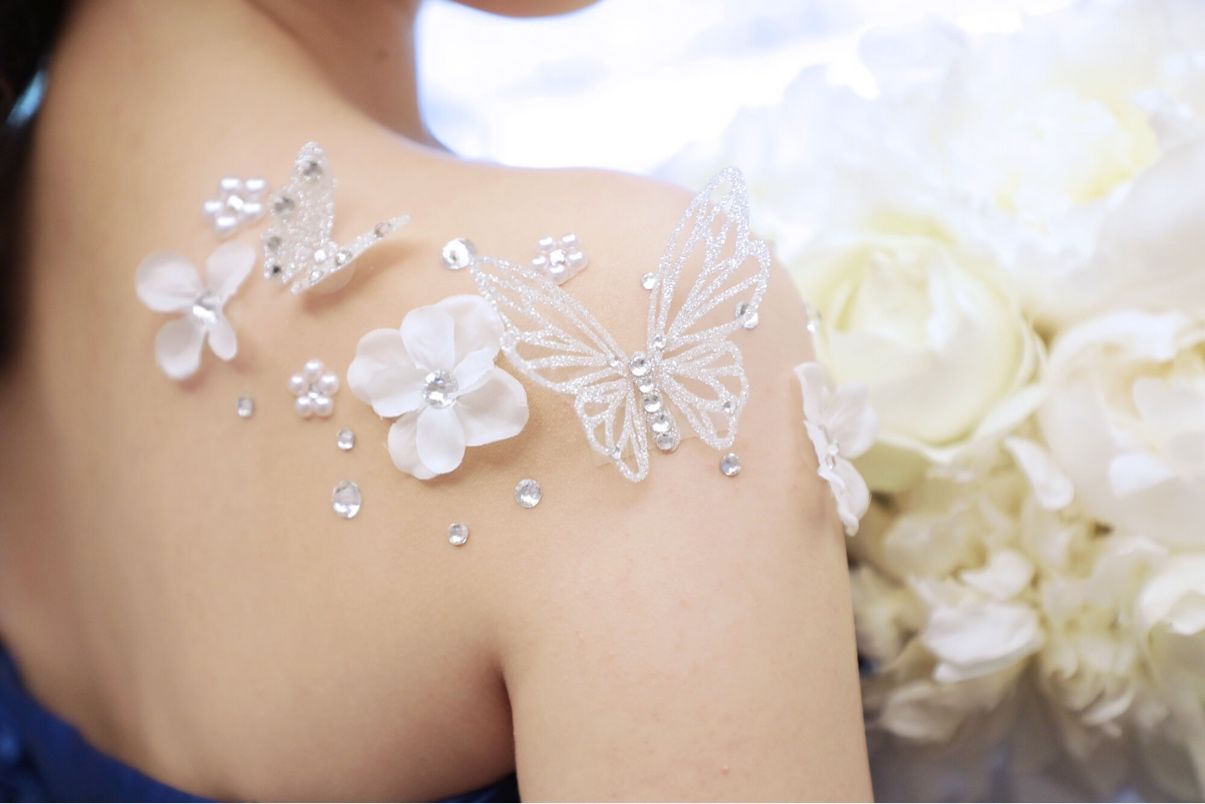 カクテルドレス:シルバーピアス(ドレスにシルバーのストーンがついていたため。ネックレスは無い方がデコルテが綺麗でした。)と蝶々と小花とストーンのシール(個人的に買って付けましたがおすすめです。)