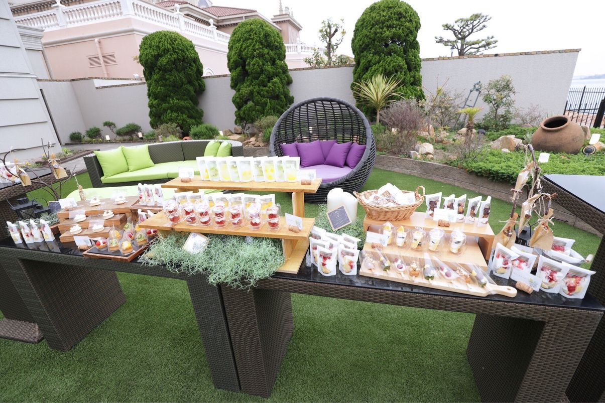 久しぶりに顔を合わせる機会になるため、アットホームを目指して席に座るだけよりもガーデンで全員が好きなように動けるようにしました。またリゾート感溢れる式場で普段と違う雰囲気を楽しめるように映えスポットやデザートを用意しました。