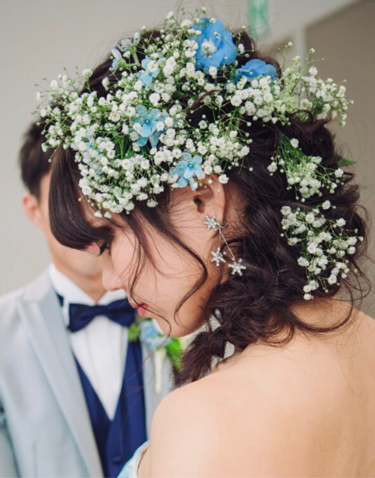 披露宴ではドレスの色に合わせて水色と白色のお花を散りばめ、イヤリングは星にしました。髪を下ろしていたので、ネックレスは敢えて付けませんでした。