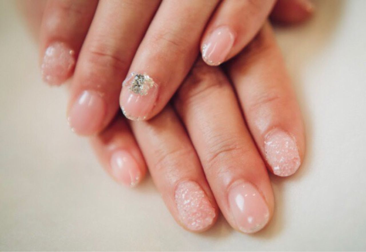 ピンクをメインに、何本かシュガーネイルにしました。指輪をつける指だけ、ビジューを多めに付けました。