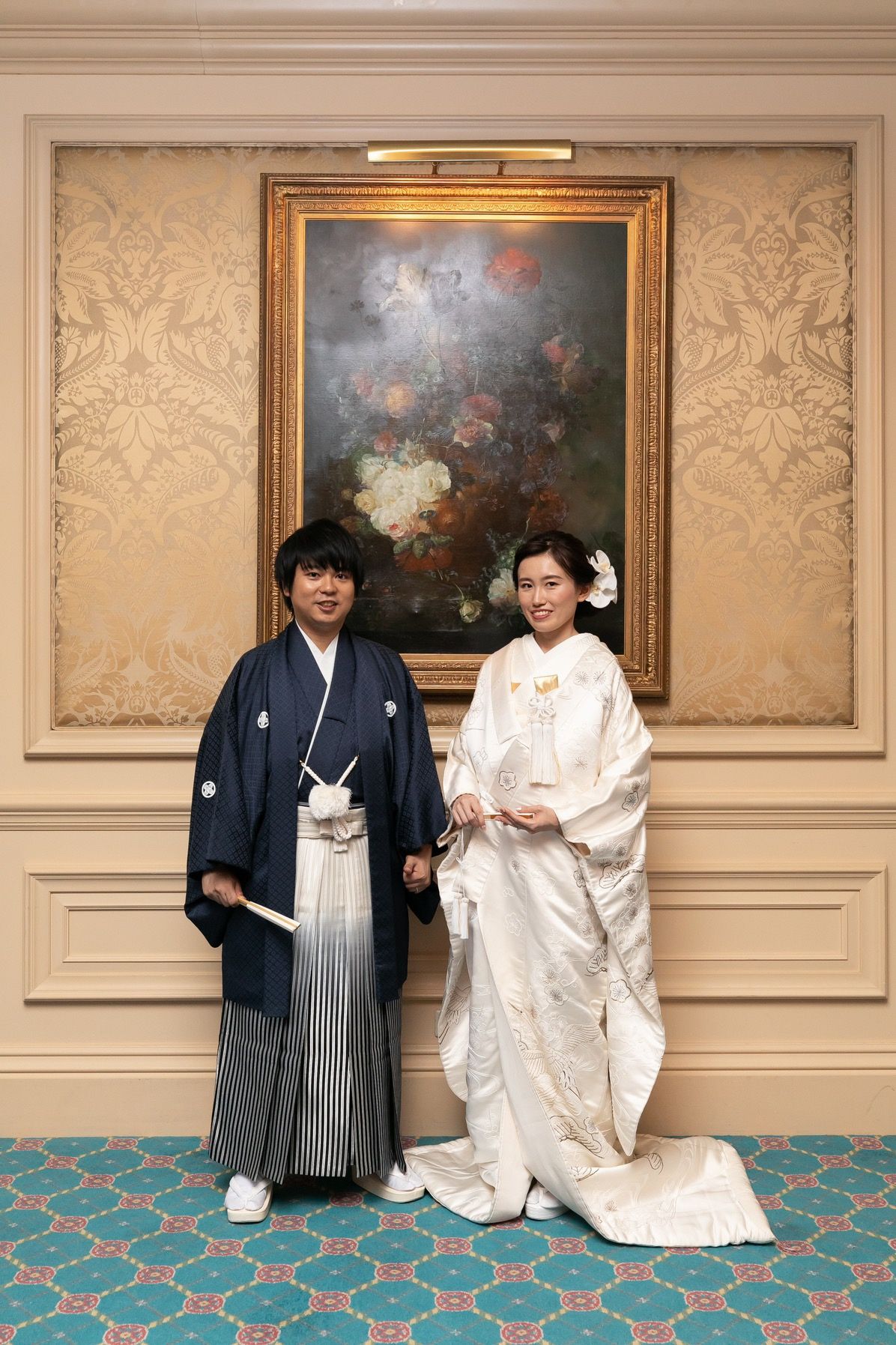 主人の祖父母が呉服屋さんを営んでいたので、見せても恥ずかしくないお柄を選びました。遠いところからの撮影だとわかりにくいですが、古典柄で金の入った相良刺繍が素敵です。