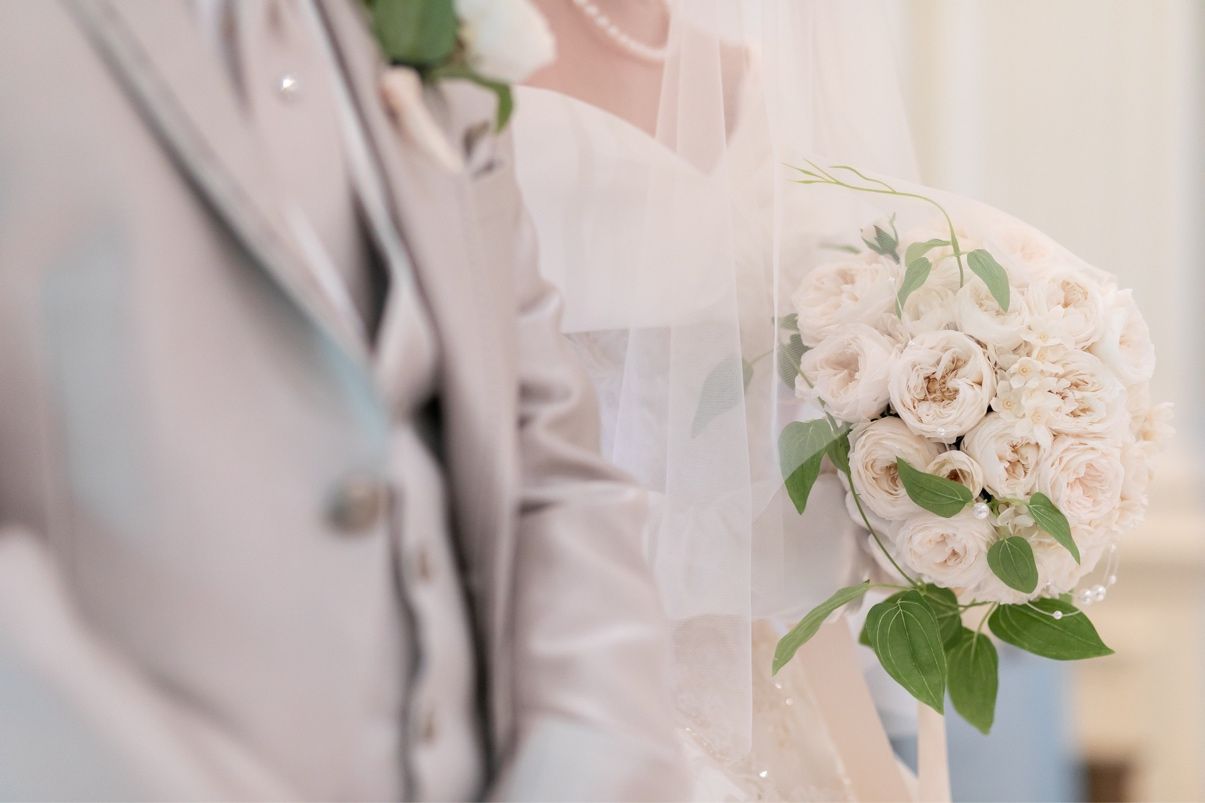 ブーケはブリザーブドフラワーで外注しました。白いカップ咲の薔薇にパール連をまきつけたデザインです。
