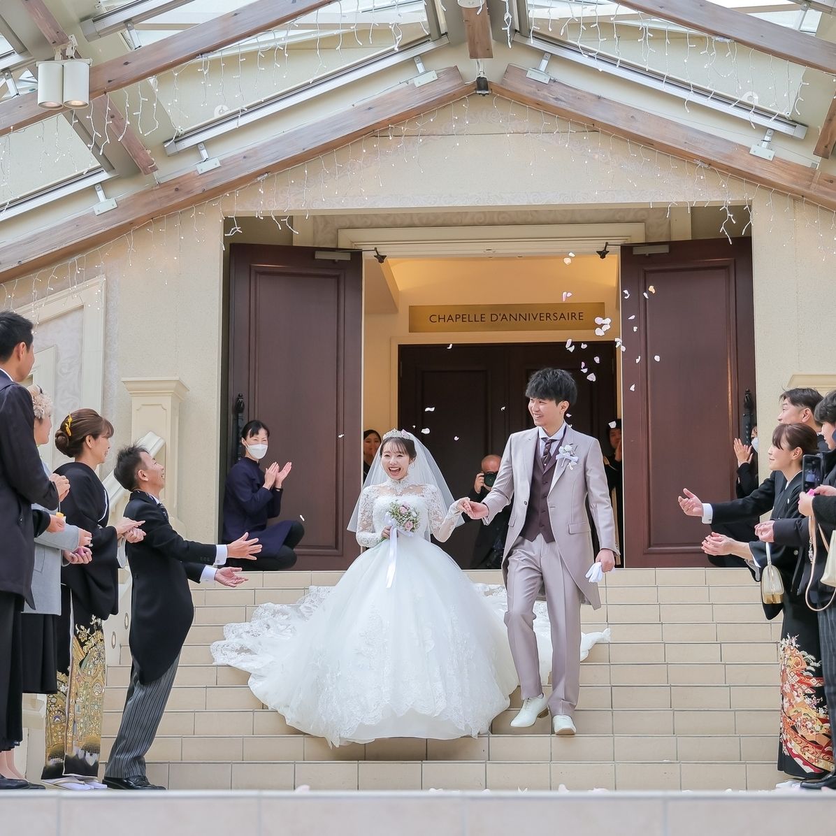 2つの披露宴会場がありますが、シンデレラのように階段から降りて再入場するのが夢だったため、中に階段のある会場を選びました!
