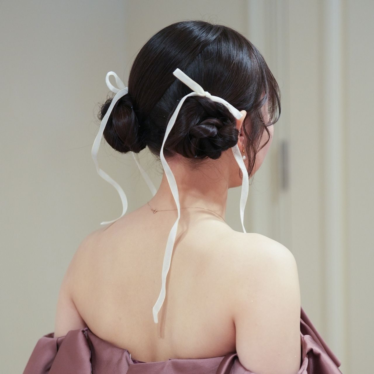 披露宴は羊ヘアのみだと寂しいので、細くて透けている少し珍しい白のベロアリボンをつけています!