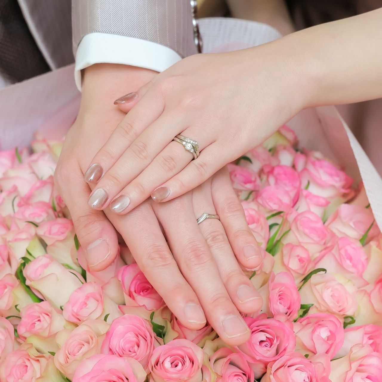 ダイヤが真ん中についている婚約指輪の邪魔をせず、重ね着けできるものが良かったのと普段使いもできるけど華やかさもあり、旦那さんとお揃いにできるものを探しました!