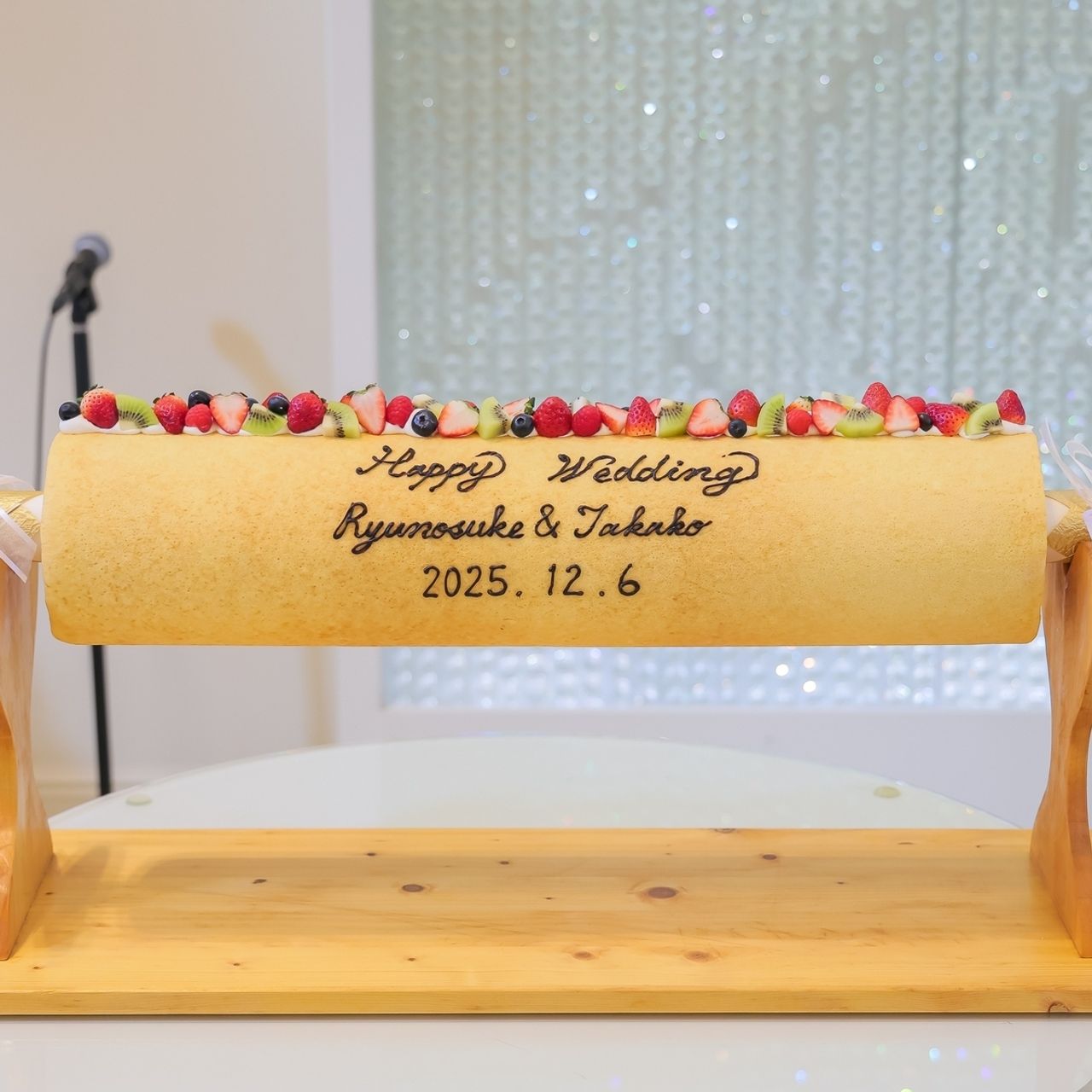 ケーキ入刀はせず、粉糖を2人で振りかけて完成させて一緒にかぶりつきました!