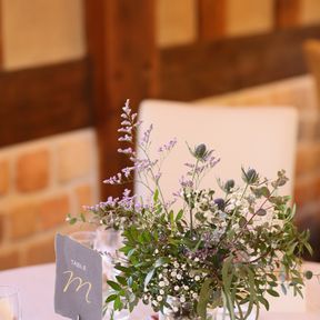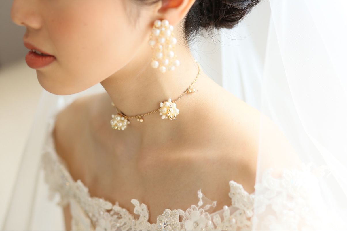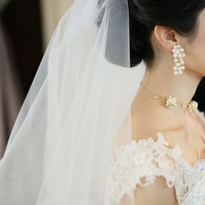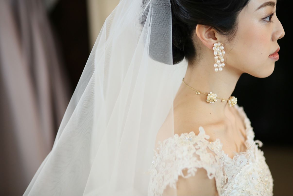 挙式では、コンパクトなシニヨンでまとめ髪と、