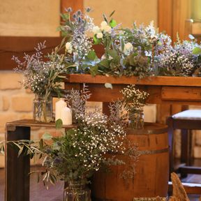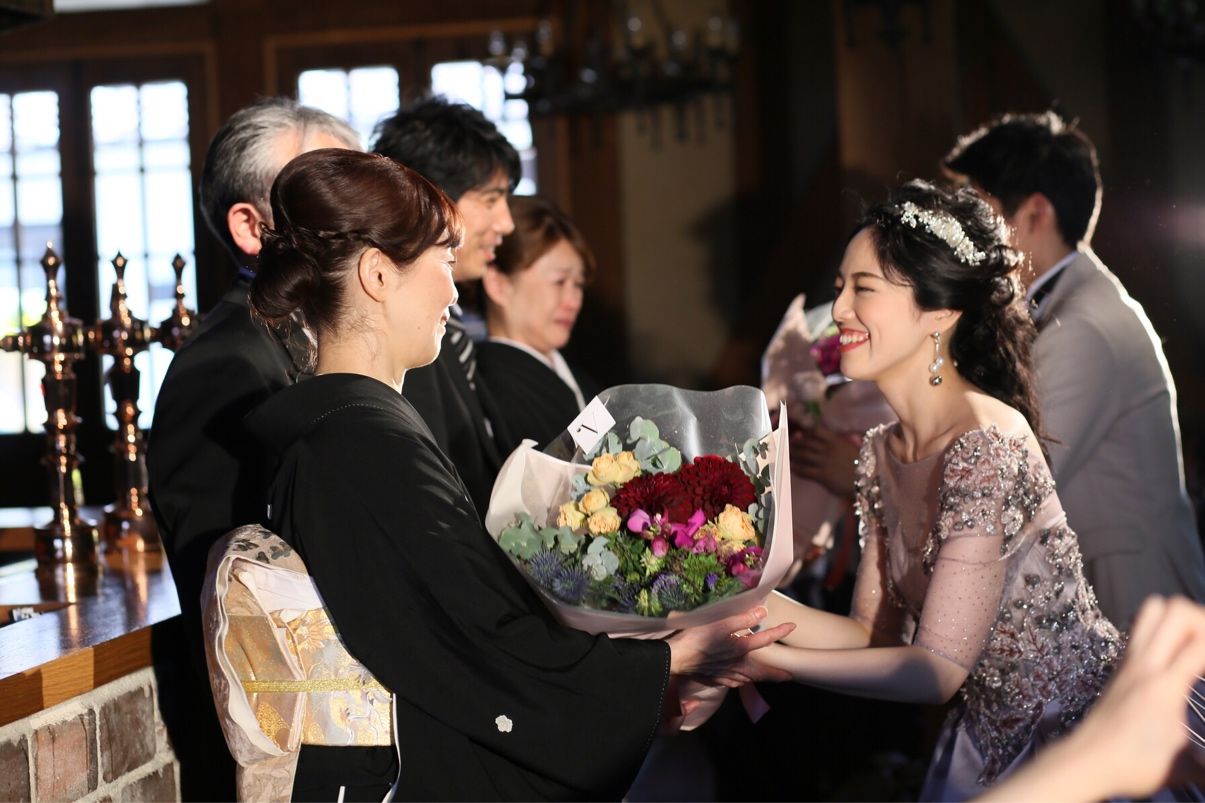 壇上にいる新郎にバラを1本ずつ渡してもらいました。