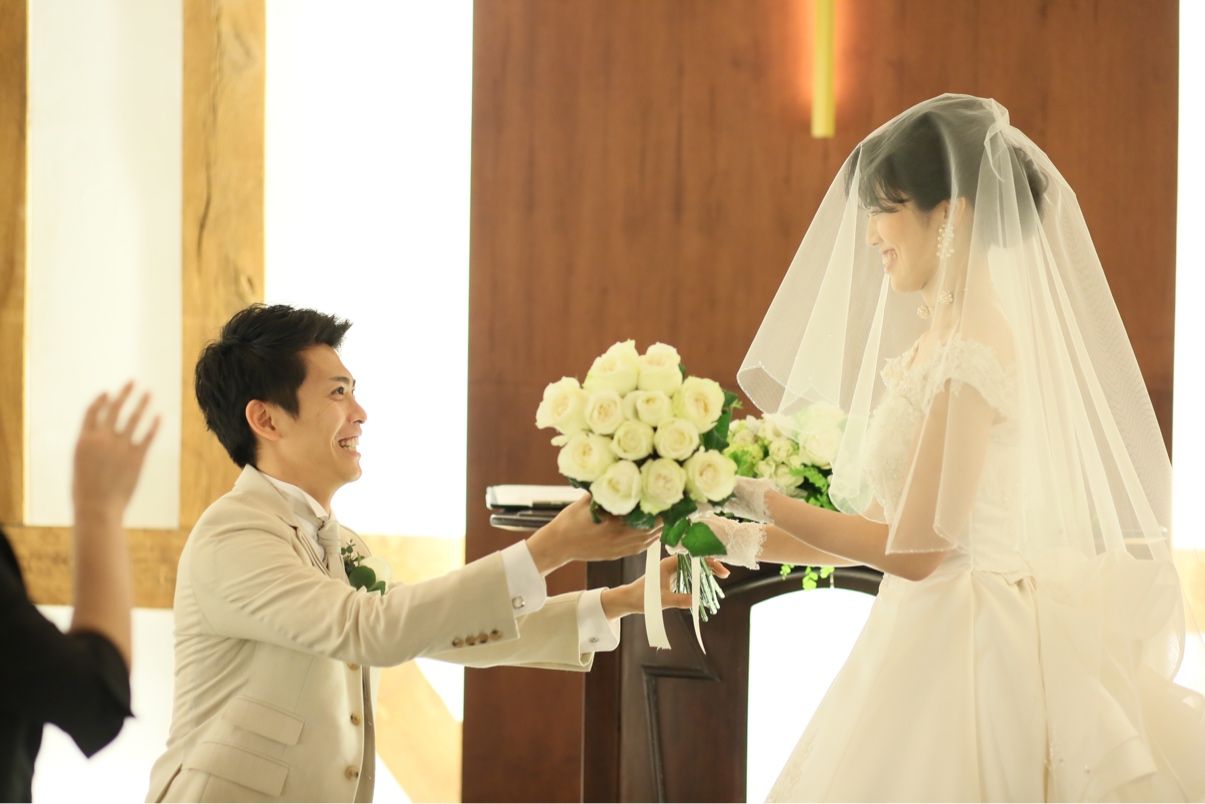 挙式では、プロポーズの際に新郎が指輪と一緒に