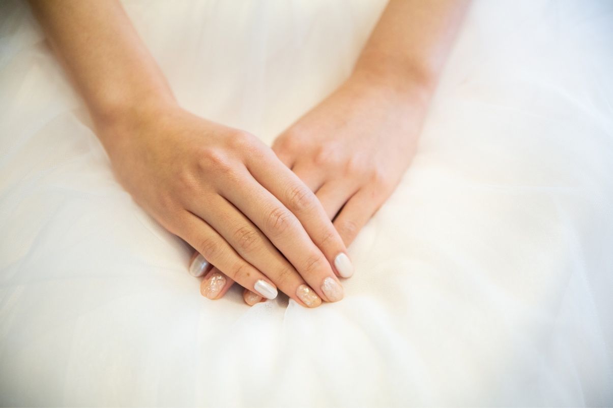 セルフネイルです。セルフネイル歴半年ほどなので、プロには劣りますが…ブライダルネイルの画像を参考に、ホワイトとベージュのデザインにしました!いかにもブライダル!という感じにはしたくなかったので、普段のネイルに近いデザインにしました!