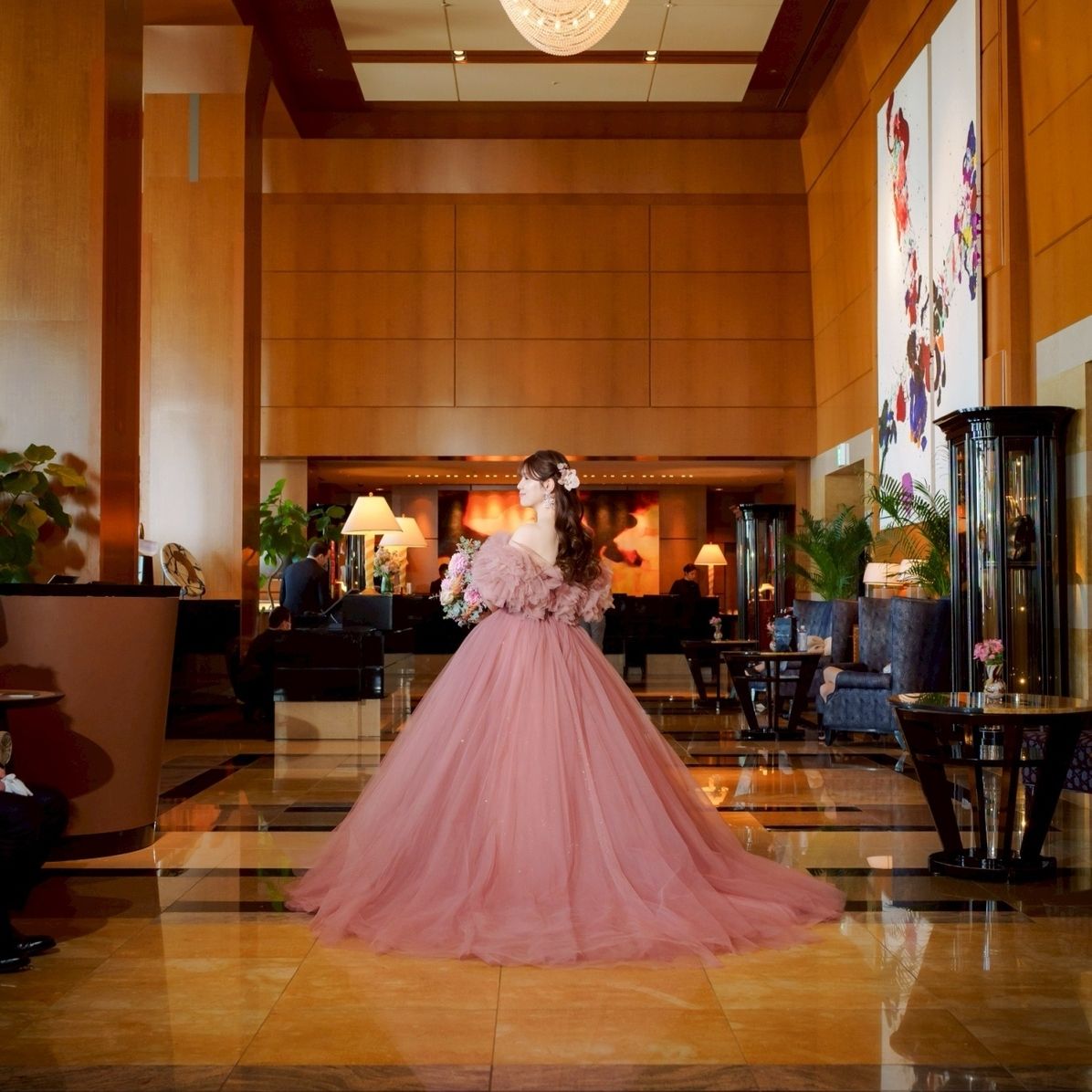ピンクのドレスは何着か試着しましたが、こちらはブラウンが少し入った落ち着いたピンクなので肌馴染みがよく、かわいいに寄りすぎない色でお気に入りです。
