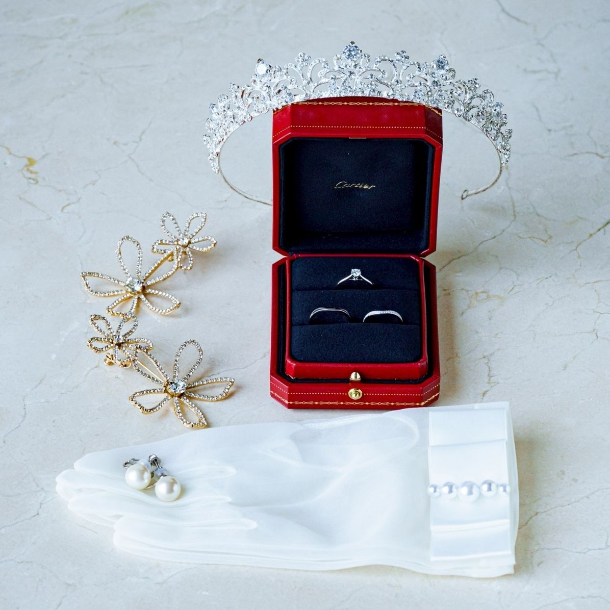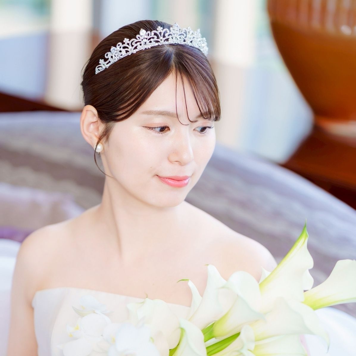 挙式はIvory&Co.のAlyssaのティアラを着けました。ティアラも何種類か試着しましたが、高さのあるものは浮いてるように見えたので、ほどよい高さで馴染みのよかったAlyssaに決めました。ドレスショップの方にも「Alyssaのほうが似合う!」と後押しいただきました。
