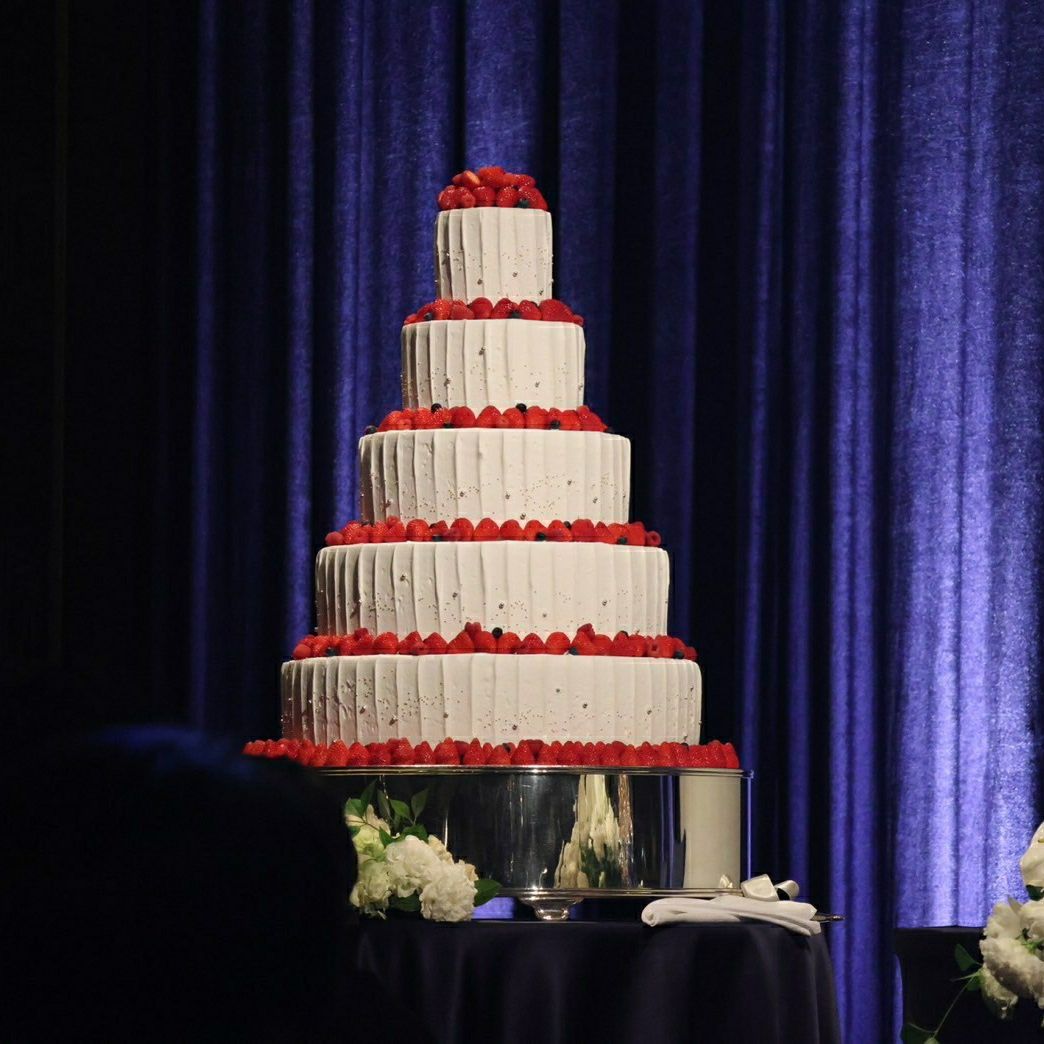 会場の天井が高いので、ある程度ケーキにも高さが欲しいと思い5段のケーキにしています。