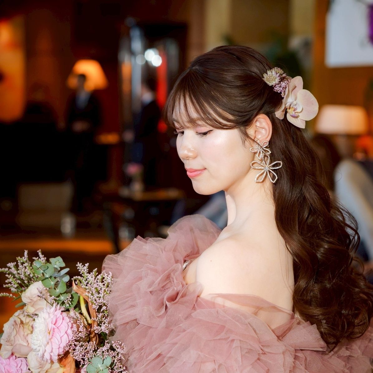 お色直しではかわいいドレスに合わせて、ハーフツインでよりかわいく仕上げていただきました。ドレスの色に合わせてアイシャドウはピンクに変更し、チークやリップもドレスに合わせて色を変更しました。