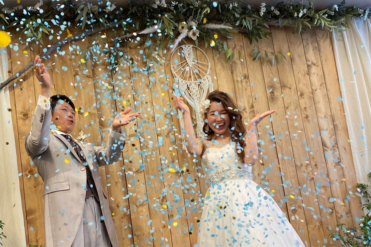 性別発表バルーンでゲスト全員にお腹の赤ちゃんの性別を発表したこと。新郎にも内緒だったのでゲスト全員へのサプライズが出来ました。