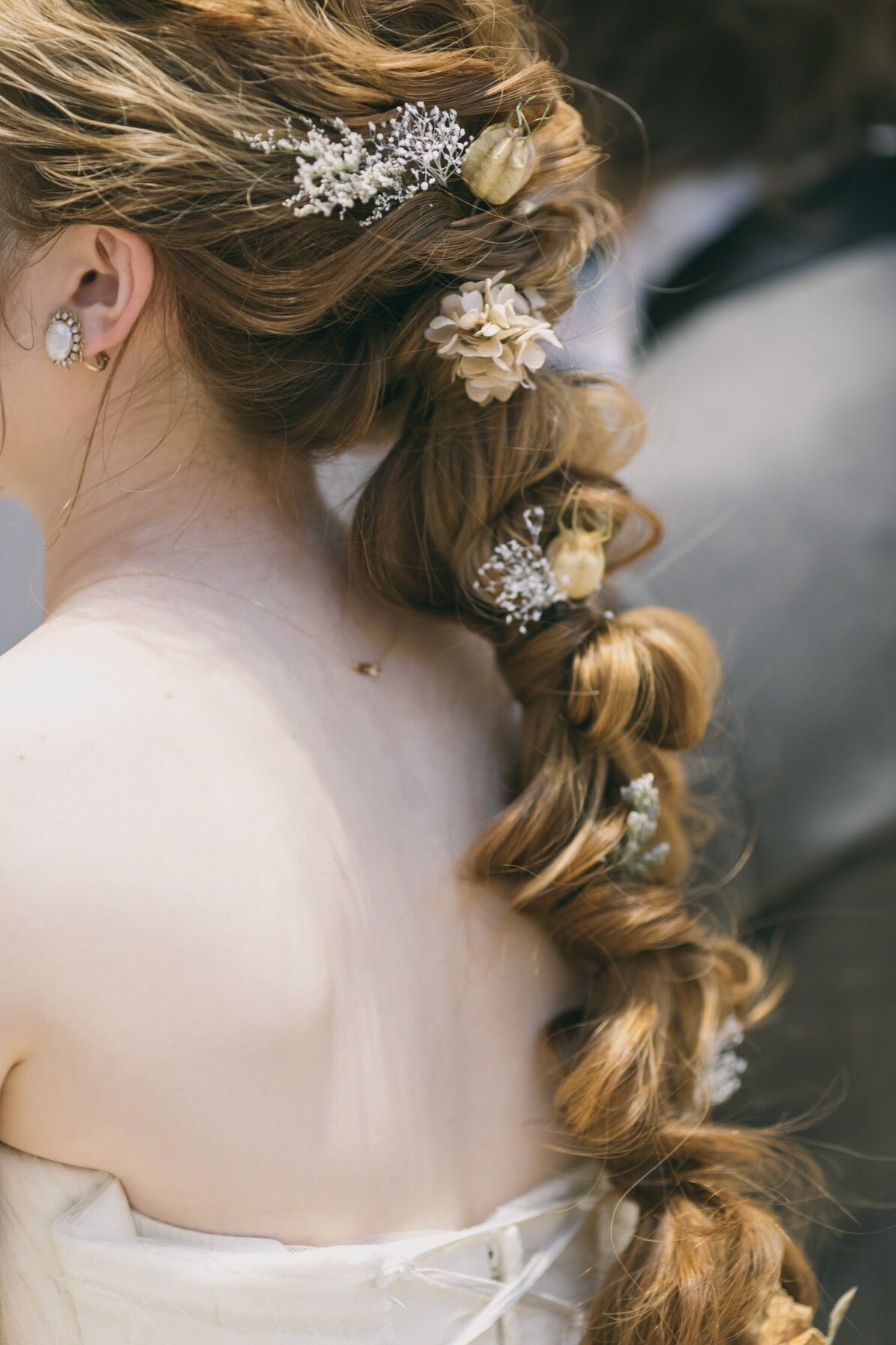 ヘアは挙式はローポニーにすこし編み下ろしを混ぜてゆるい感じにしました! 披露宴では、編み下ろしにしてふわふわラプンツェルヘアーにドライフラワーを装飾しました。