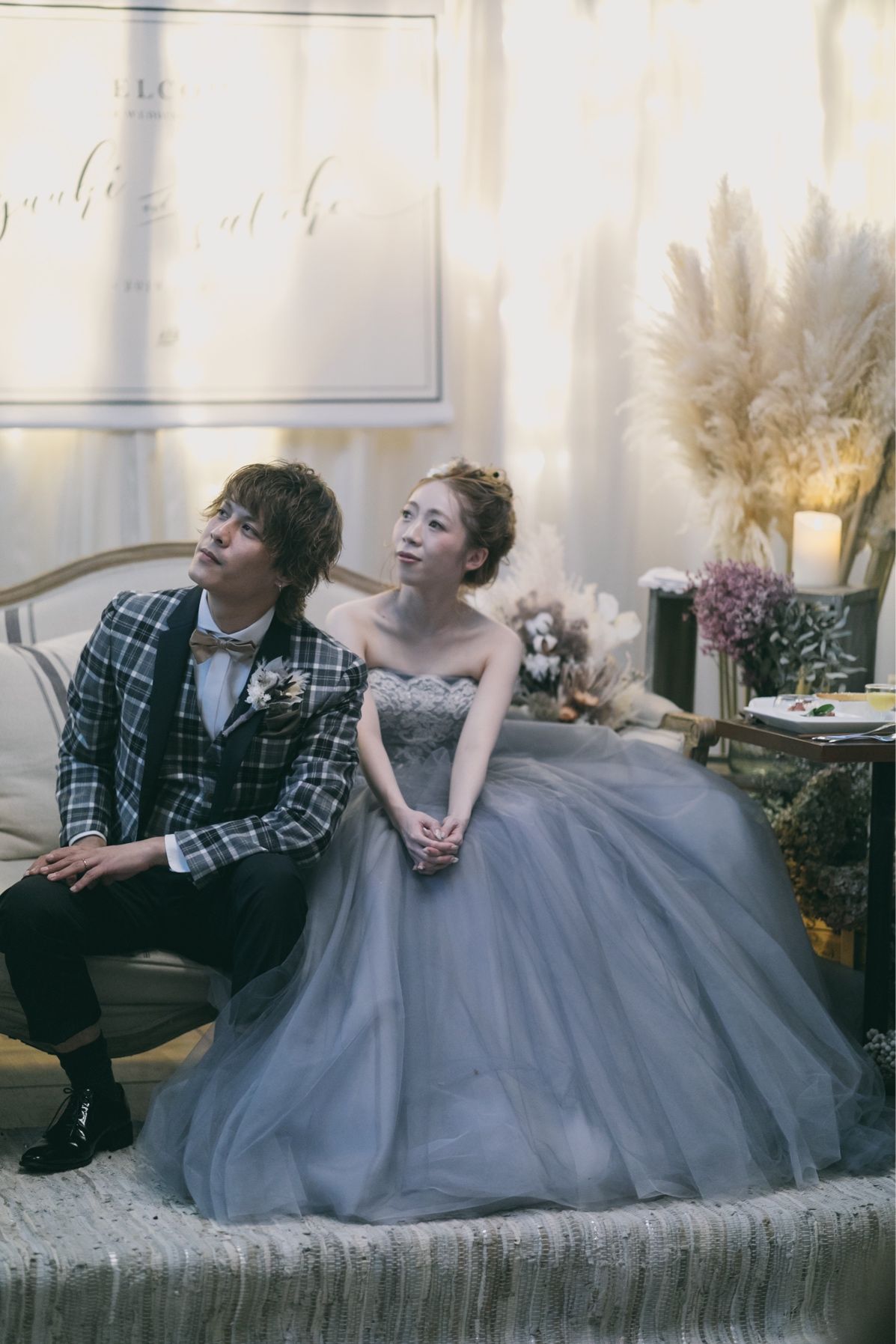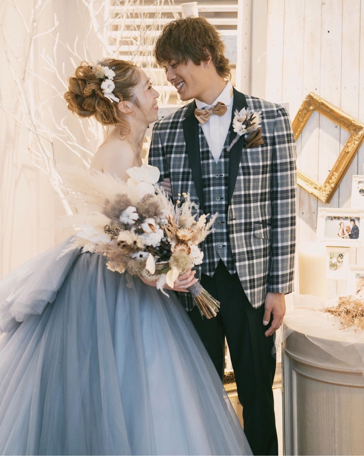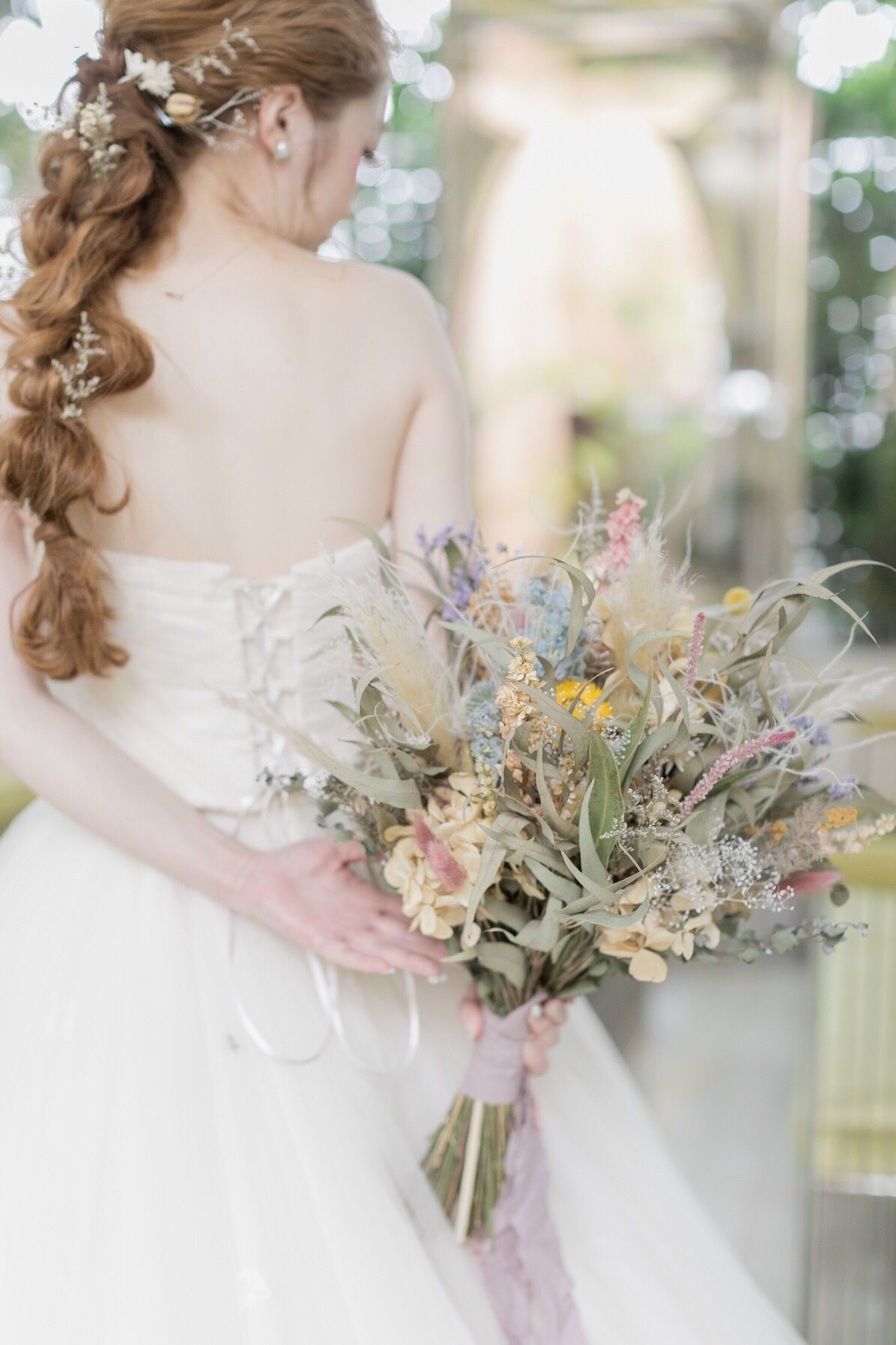 ドレスもドライフラワーに合うレース、チュール、カラードレスもグレーに。ヘア装飾もドライフラワーと とことんこだわりました!