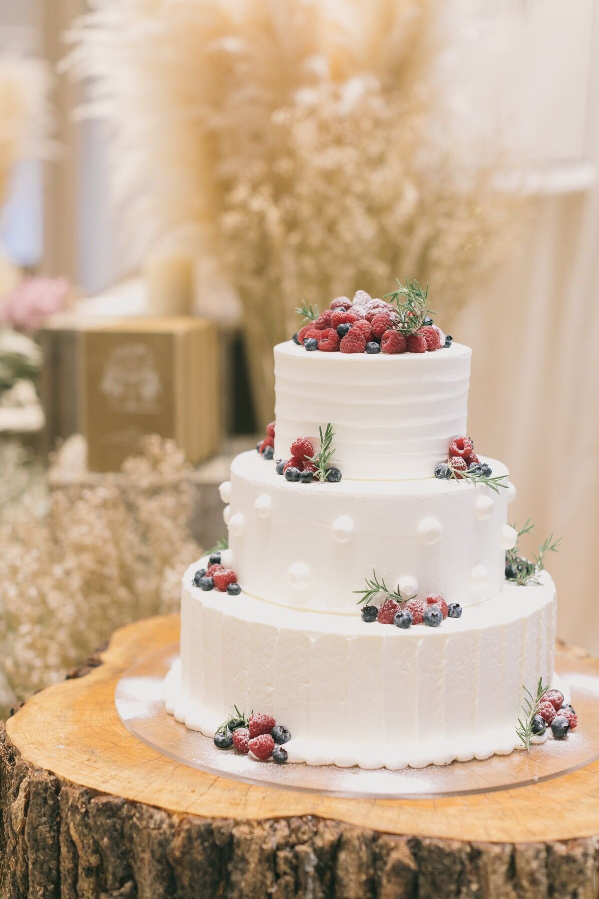 ウエディングケーキは会場の雰囲気にあうようにイチゴやベリー系をメインに白い粉を上からふっていただいて、可愛いかんじにしました!