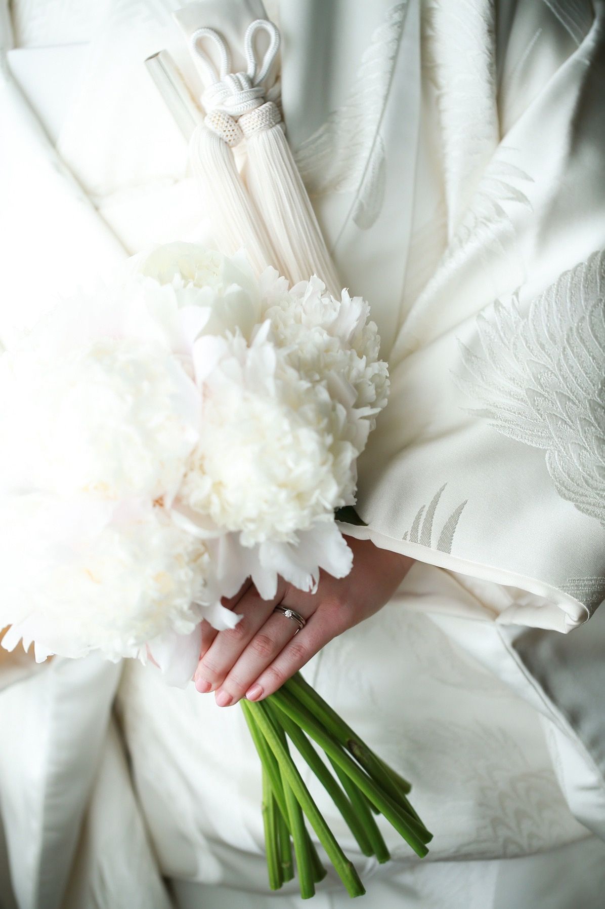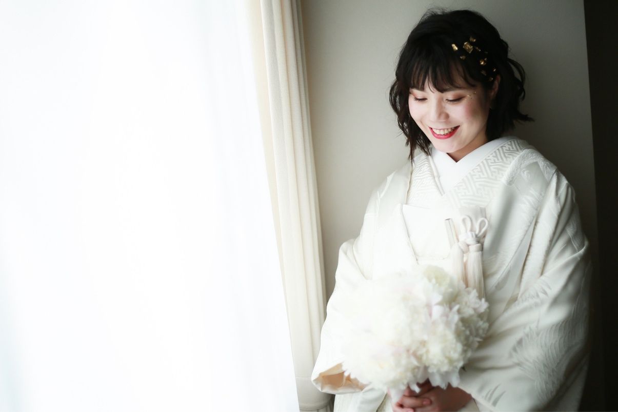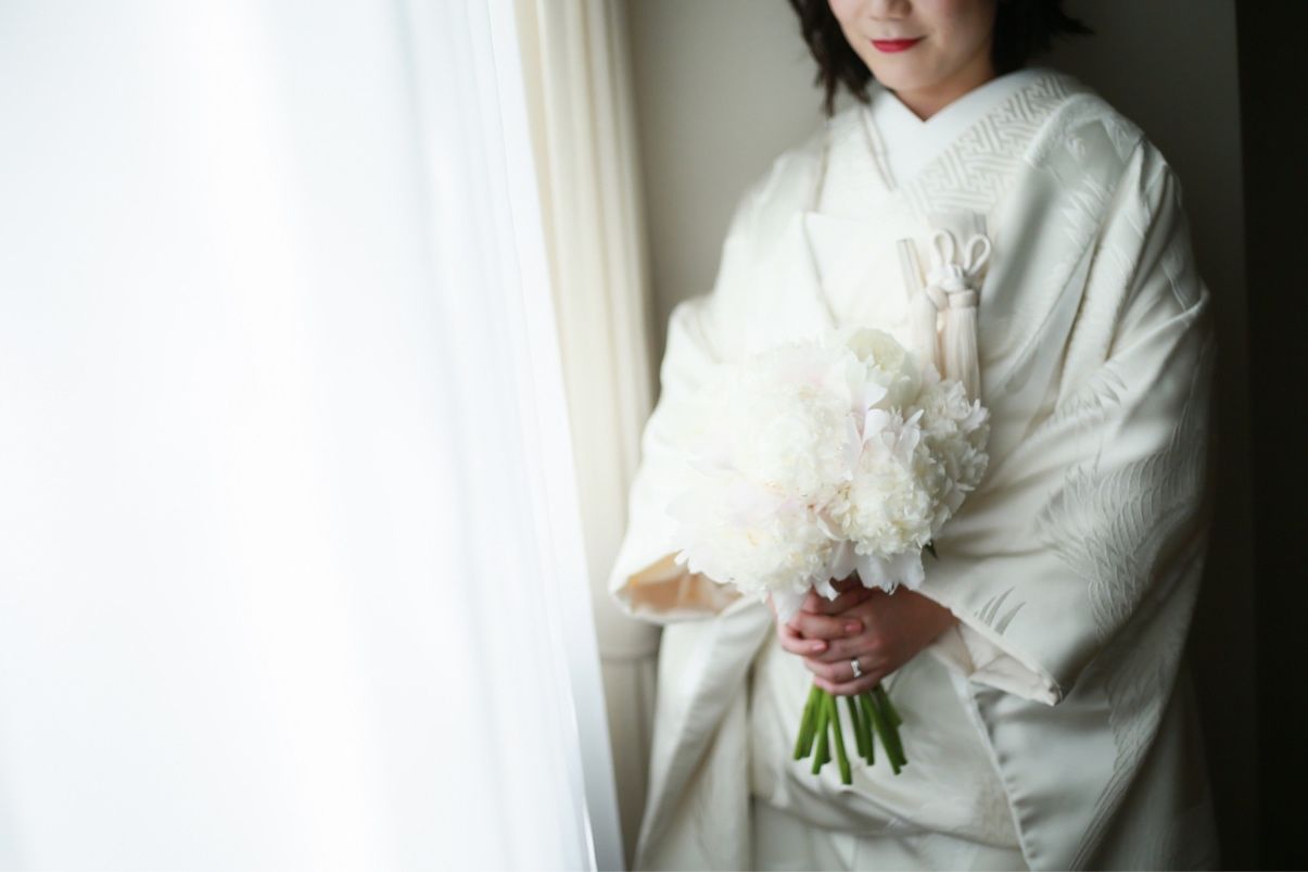 シンプルで控えめだけどブーケのほんのりピンクとぴったり合って、白無垢スタイルに馴染んでくれたのでお気に入りです。