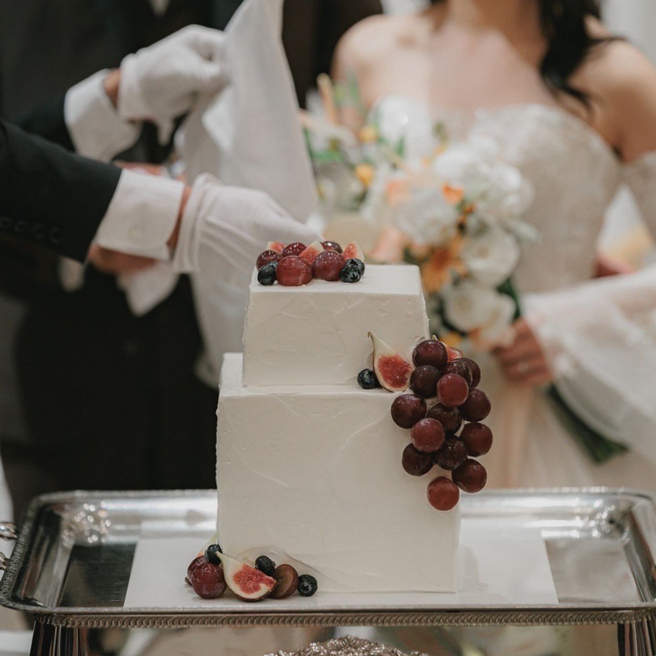 式場のナチュラルな雰囲気が出せたらなと思い、スクエアの二段ケーキに季節のフルーツをトッピングしていただきました。ぶどうもイチジクもとても美味しかったです。
