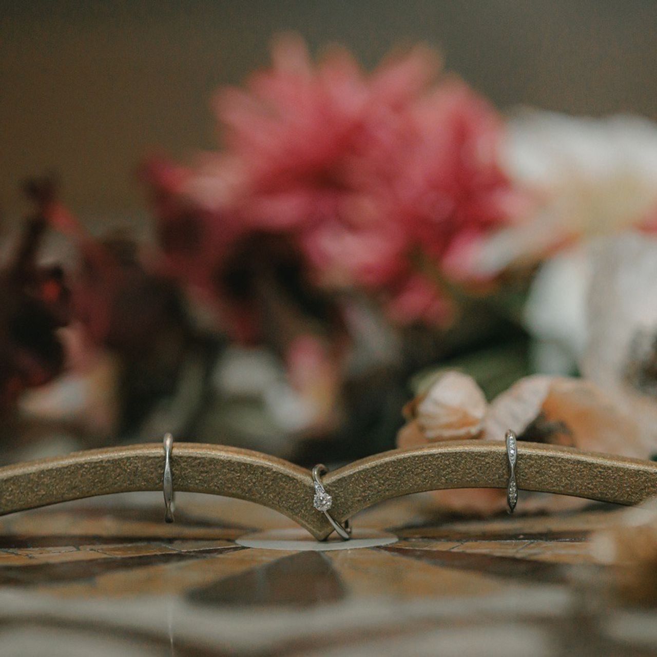 CHANELのカメリアコレクションにしました。婚約指輪とは反対に、結婚指輪はデザインを見て一目惚れ。カメリア(椿)の花を模した特徴的な形の指輪です。私はハーフエタニティ、旦那は石のないシンプルなものに。