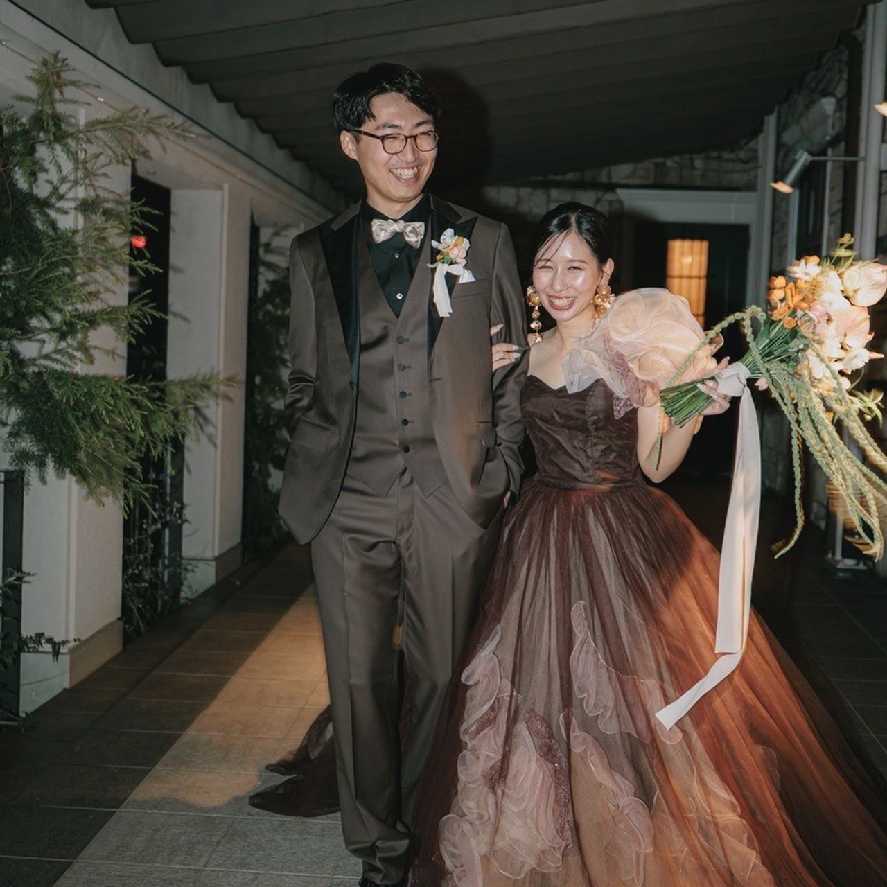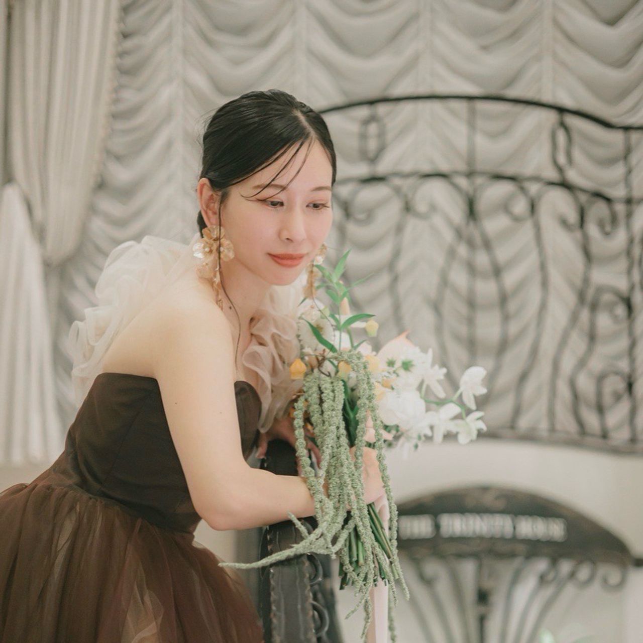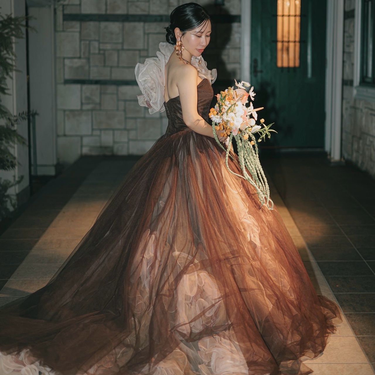赤みがかった深いブラウンでありながら、ドレスと肩の花飾りのおかげで、とても華やかで女性らしさがあって気に入っています。