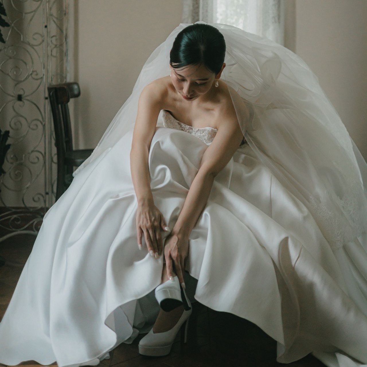私の背が147cmと低く、旦那の背が178cmで高いので、差を埋めるために12cmのヒールを着用しました。結婚式以外では絶対にこんな高いヒールを履かないので、式場からレンタルさせていただいたものです。