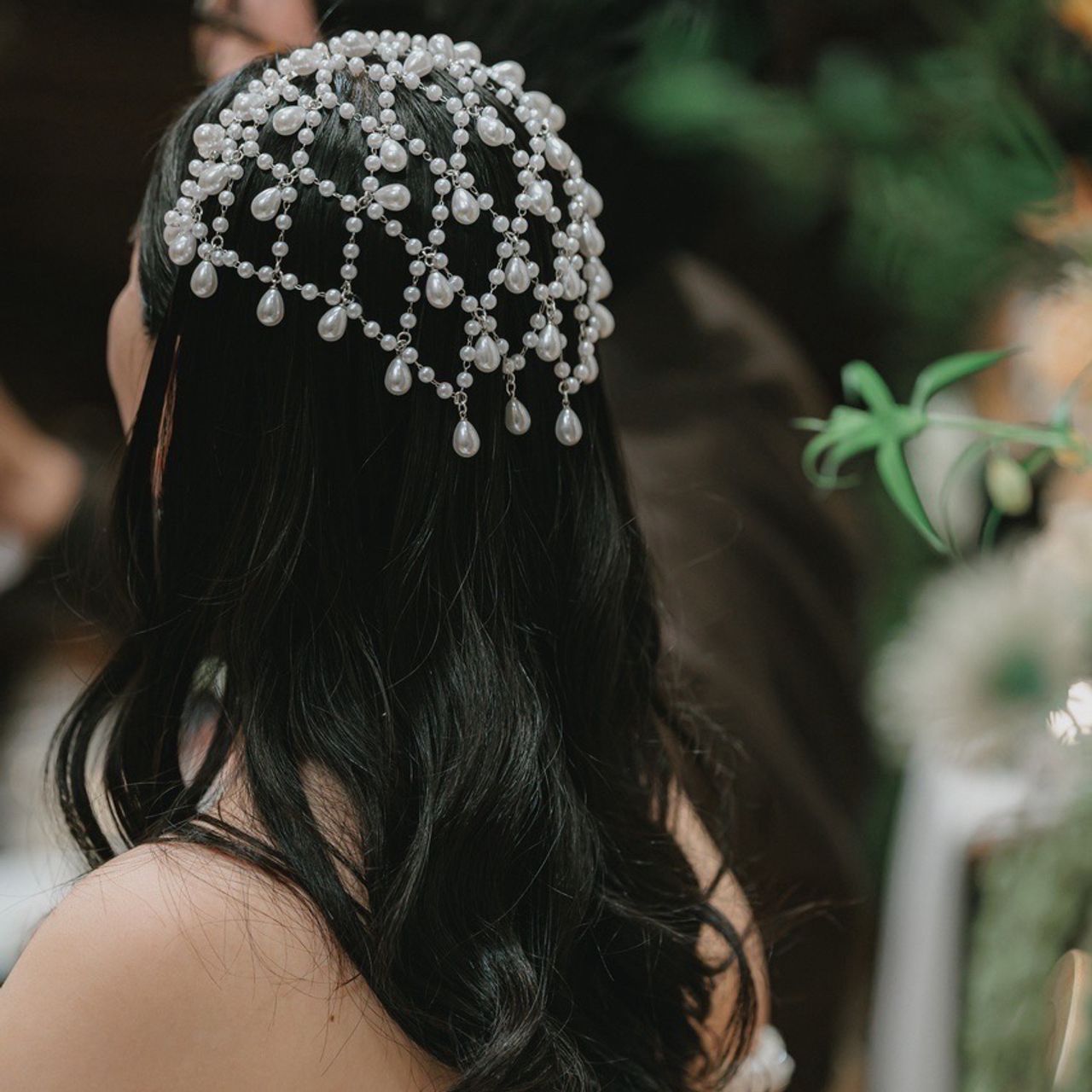前から見るとカチューシャのように、後ろから見るとヘッドドレスのように見えるイミテーションパールのアクセサリーです。