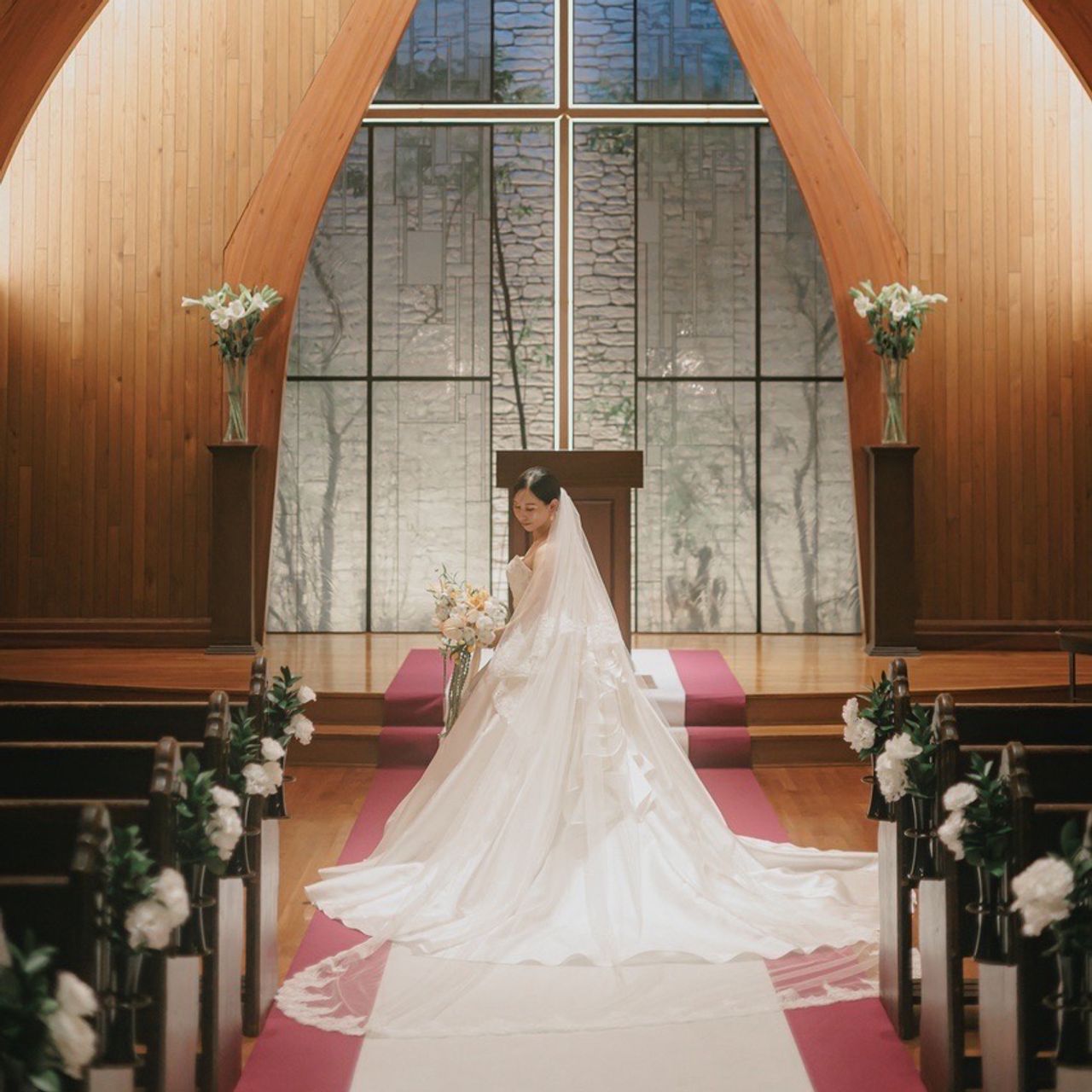 かつては礼拝堂として使われていた独立チャペルです。大きな会場ではありませんが、結婚式のために建てられたものではないからこその厳かな雰囲気と、歴史を感じるところが気に入っています。深い木の色と赤のバージンロードにウェディングドレスが映え、どこから撮影しても素敵な写真になります。