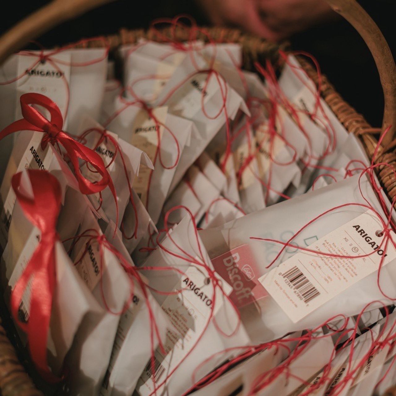 私たちがお気に入りのドリップコーヒーに、Lotusのビスケットを添えてお渡ししました。ラッピング袋やサンクスタグも手作りです。