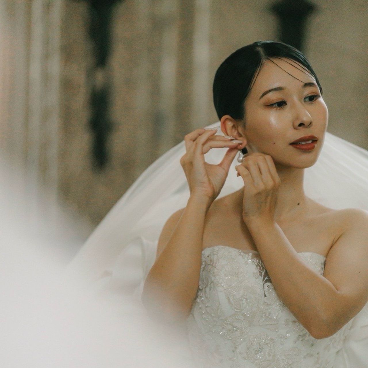 ゴールドの大きなお花のピアスを着用しました。ブラウンのドレスにも、装花のオレンジにも馴染んでお気に入りです。