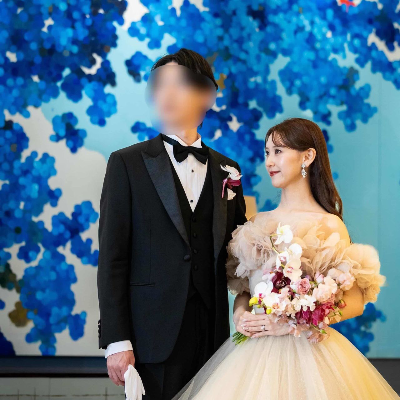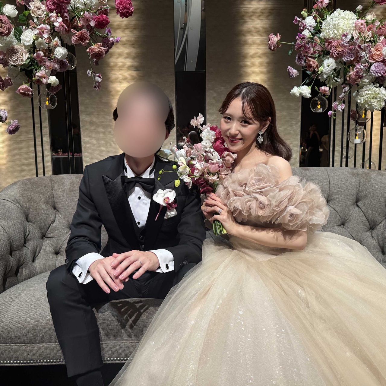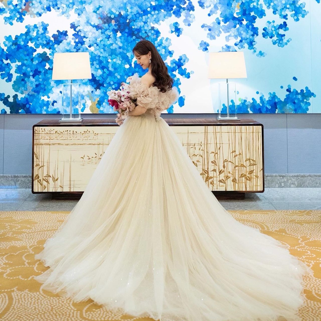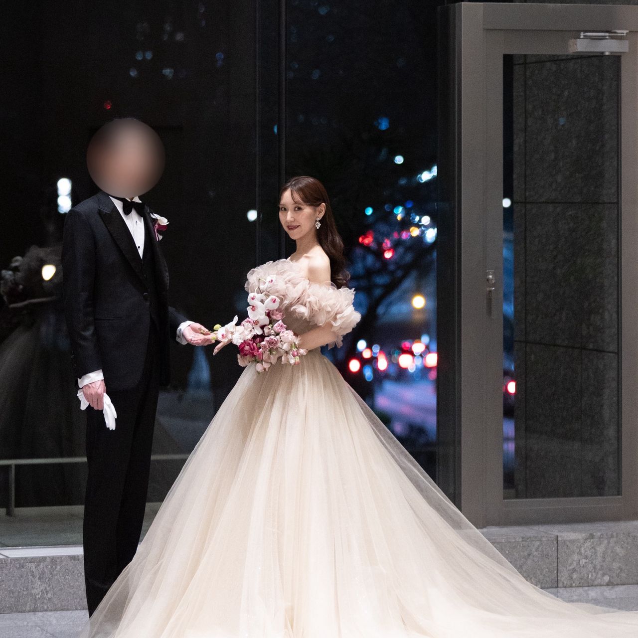 動いたときのシルエットの美しさも本当に印象的で、パレスホテル東京のチャペルとの相性も抜群でした。まさに「王道だけど洗練されている」一着だと思います。