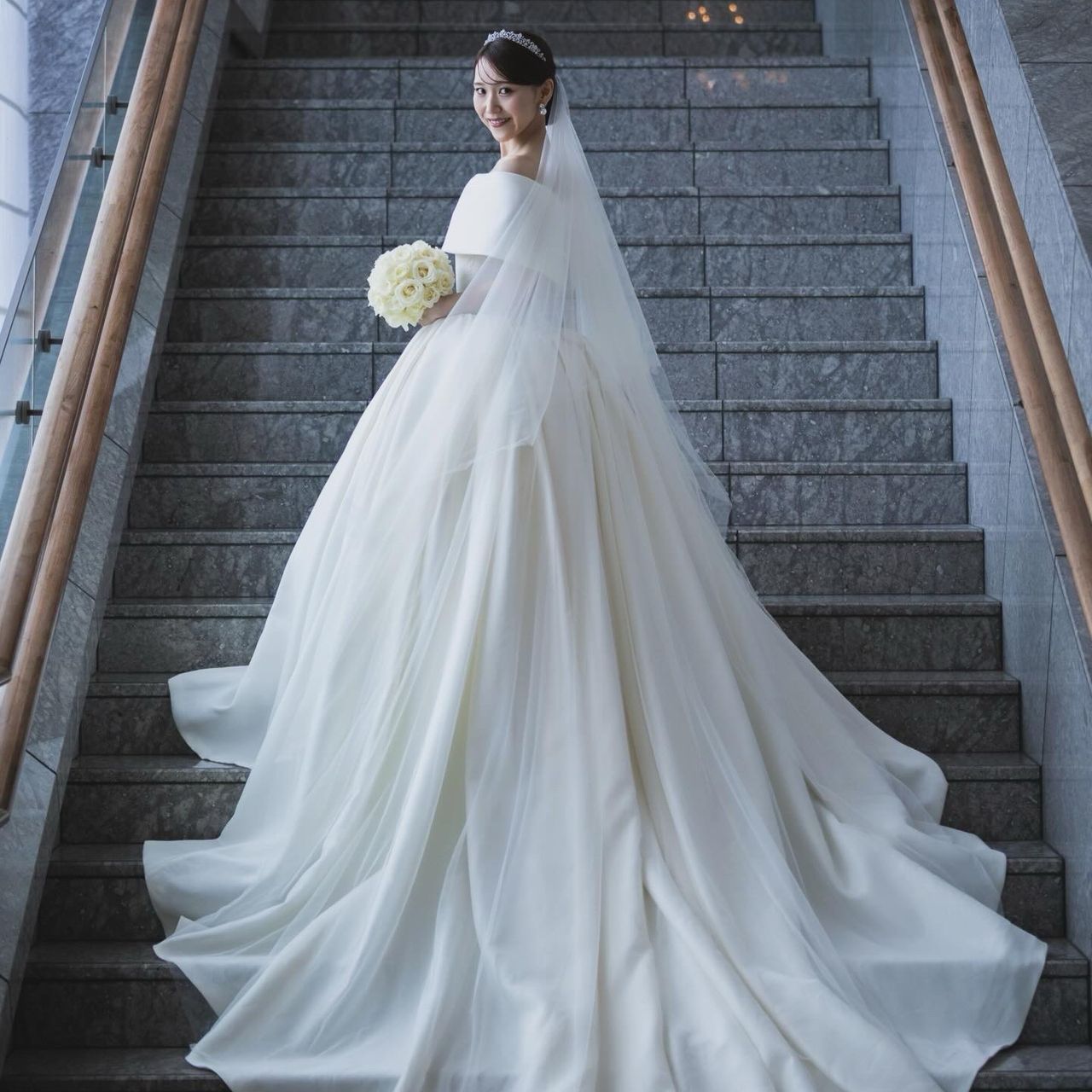 レンタルのベールだと、短すぎるか長すぎるものしか無く、ドレスからはみ出てしまう部分がどうしても気になったため、トレーンの長さにぎりぎり収まる長さのものを探して購入しました。パレスホテル東京(PALACE HOTEL TOKYO)の階段でのショットでも、ベールの丈感がきれいに収まり、大満足でした。