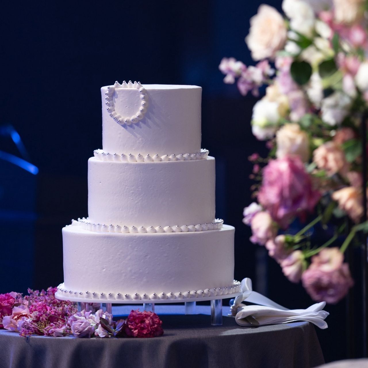 ケーキ自体にお花をつけることもできましたが、あえて付けずに、ケーキの周りにメインテーブルの装花に合わせたお花を散りばめてもらいました。